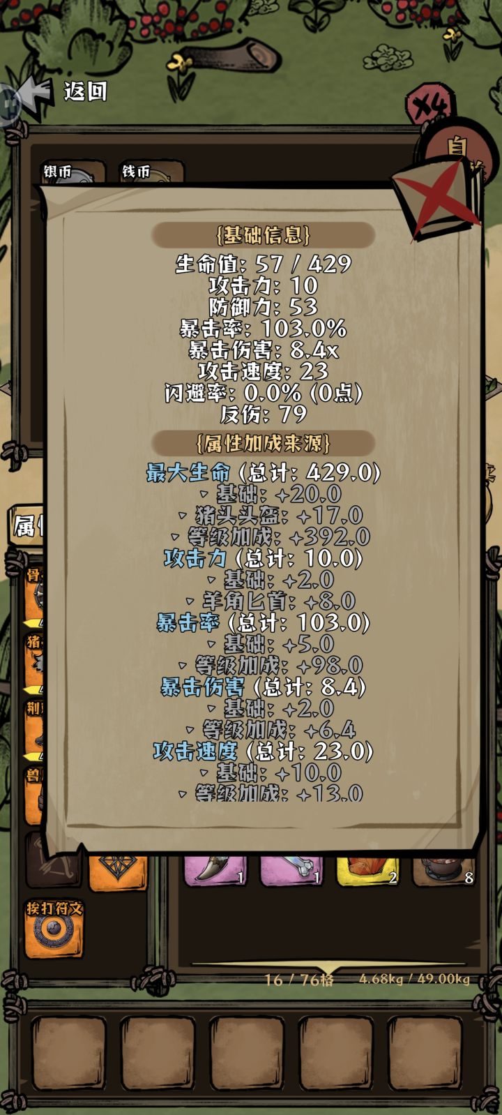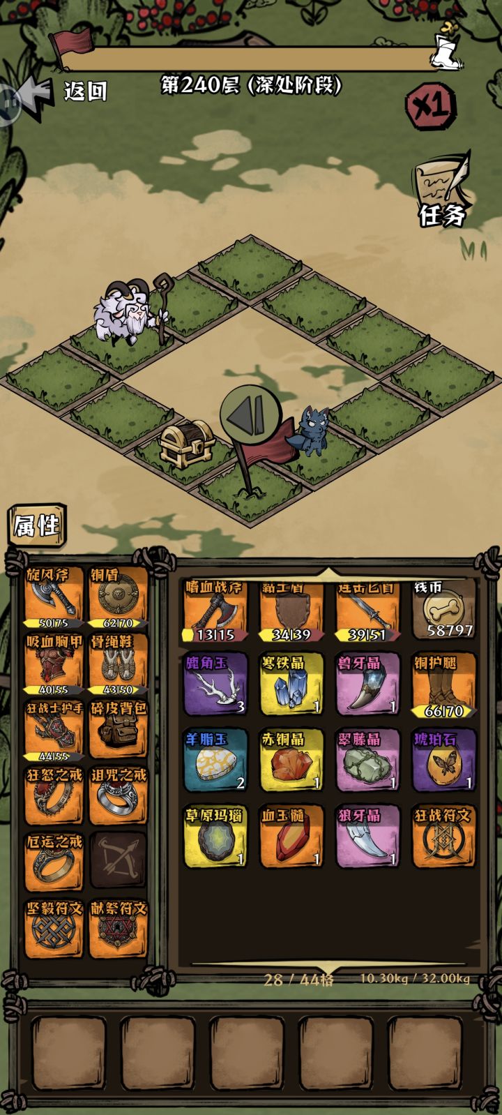 主线阶段,升级属性攻击>暴击>爆伤>生命>攻速>背包格子>幸运攻击收益相对最高,伤害计算是(攻击-小怪防御)×爆伤;后期传说坚毅符文可以将2点攻击转为1点防御,弥补生存能力。因为可以花铜币重置等级,我可以分为前期养成阶段和后期无尽爬高阶段。⭐️养成阶段:优选攻击>背包格子>幸运/暴击/爆伤,主线到达羊村山脚,中阶刷狂怒戒指(每回合增加百分比攻击),深处刷坚毅符文(攻击转化为防御),绿色紫色都