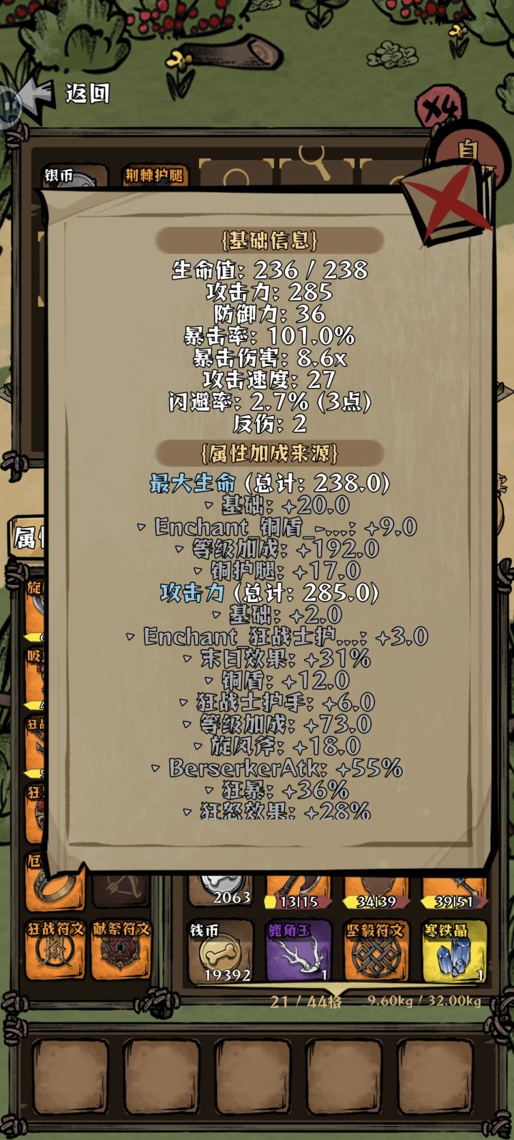 先叠甲,作者菌没有进官群,算是自己游玩时在一个小意外发现的这个机制流派。看前面的帖子有人能打出上万伤害,而作者菌目前只能打出3000+。感觉这个玩法应该很多人发现了,所以作者菌对于这个流派的理解不一定是最新最优的。大家如果对于玩法内容有更好的理解可以补充叠完甲了。首先看图1和图2。分别是出门前的197攻击和叠完的614攻击。其中叠攻的最重要的两个帮手是图3里的吸魂符文和狂战护手。这两个在图二里分