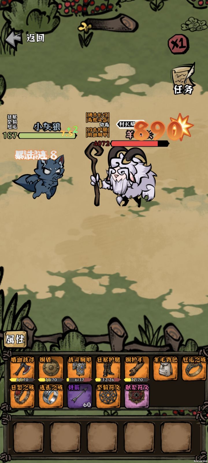 毕业武器-嗜血战斧\疾风双刃副手-铜盾(因为我们是满爆就不用羊角了)头部-前期羊村守卫头,后期野山羊角头盔(暴击头没实装,如果实装了建议带暴击头)胸部-吸血胸甲腿部-铜护腿,前期用粘土过度也不错(暴击腿没实装,不然就带暴击腿)手臂-前期铜护手或者狂战士,后期吸血护手双吸血戒指-狂怒戒指符文-献祭符文+坚毅符文3个属性转换符文15生命=1攻击3攻击=1防御4防御=1攻击首先这