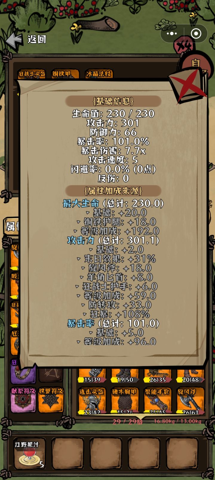 先叠甲,作者菌没有进官群,算是自己游玩时在一个小意外发现的这个机制流派。看前面的帖子有人能打出上万伤害,而作者菌目前只能打出3000+。感觉这个玩法应该很多人发现了,所以作者菌对于这个流派的理解不一定是最新最优的。大家如果对于玩法内容有更好的理解可以补充叠完甲了。首先看图1和图2。分别是出门前的197攻击和叠完的614攻击。其中叠攻的最重要的两个帮手是图3里的吸魂符文和狂战护手。这两个在图二里分