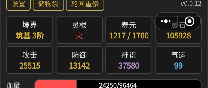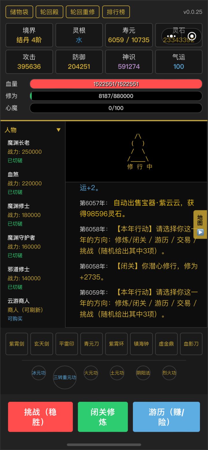 基本上就是闭关,灵石已经花不完,除了挑战强敌和闭关,游历就是纯纯垃圾,估计点闭关大半小时才能升一阶,13%概率仙品技能,五个,已经百分百突破了