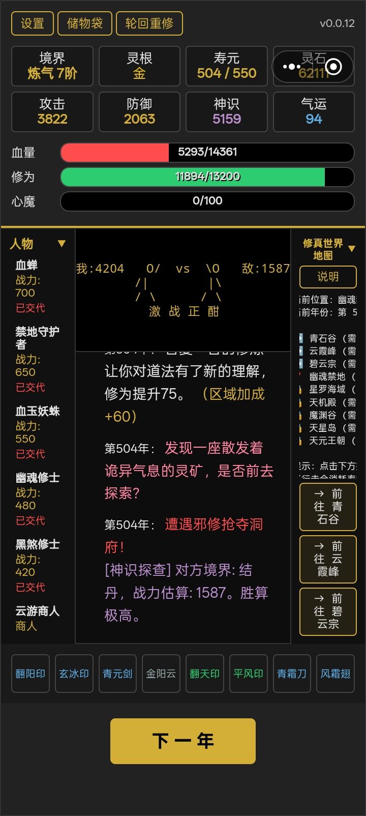 基本上就是闭关,灵石已经花不完,除了挑战强敌和闭关,游历就是纯纯垃圾,估计点闭关大半小时才能升一阶,13%概率仙品技能,五个,已经百分百突破了