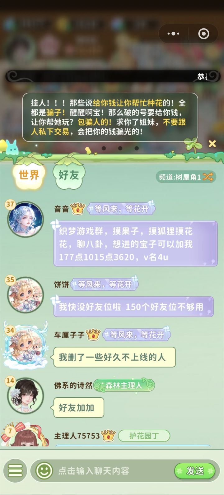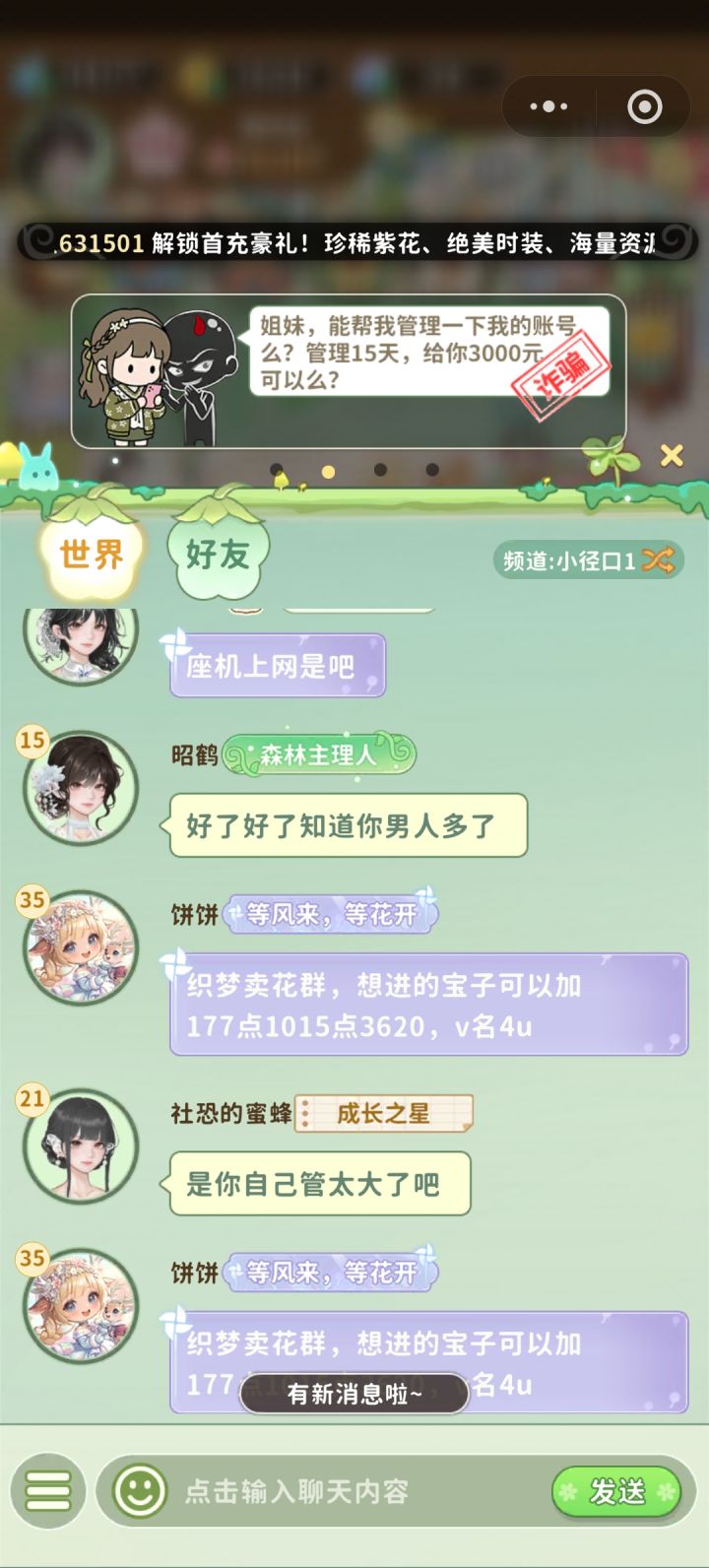 游戏环境很差,微信小程序里一堆人刷屏宣群也不管,正儿八经问问题的都要看不到了,还不让别人说,说了就一堆人抨击你管的多,让你爱去哪个频道去哪个频道,拢共就三个频道,其中两个都有点这种宣群的,也不管管,万一有个搞诈骗的就上当去吧,一堆氪金礼包什么的