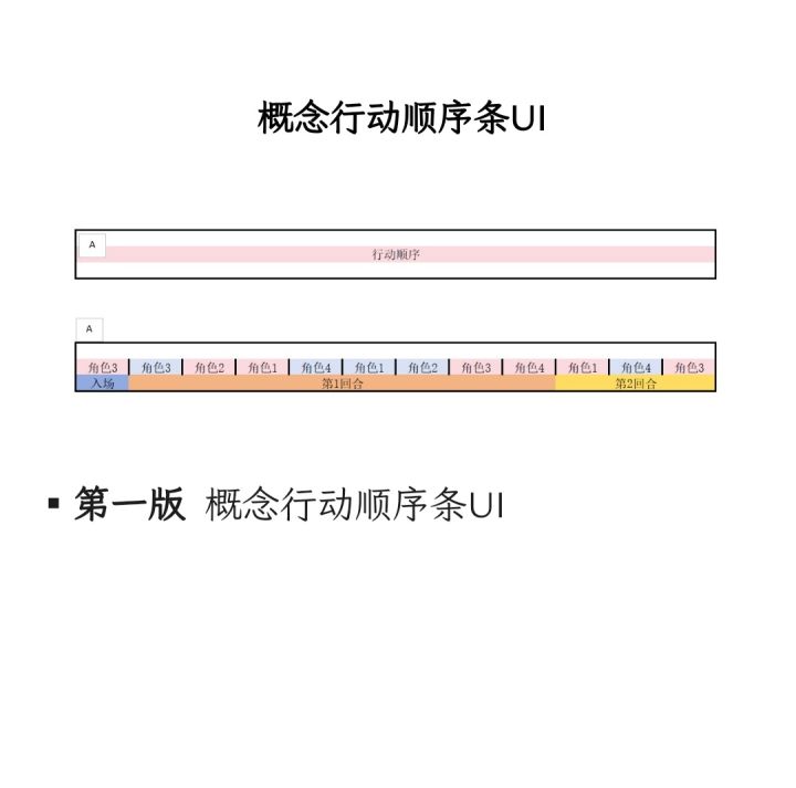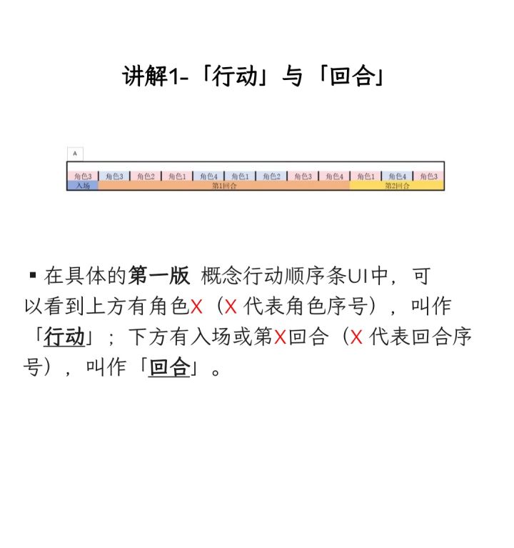 问:不知道半即时回合多人对战游戏有没有搞头?▪图2为第一版 概念行动顺序条UI的示意图,上为简略图,下为详细图(战斗中展示的均为详细图)。▪图3为「行动」与「回合」的讲解。▪图4为「回合」的讲解。▪图5为「行动」的讲解。构思篇3-2将根据详细图提到,一个比较具体的、最基础的实战状况了。最后,也欢迎大家一起,交流交流