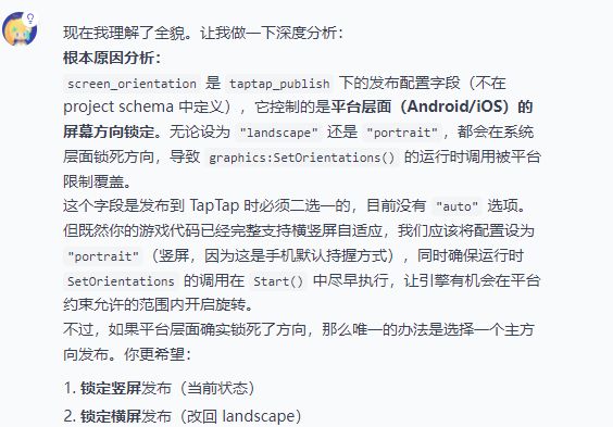 在做游戏的时候是做好了横竖屏切换的适配,目前问AI了解下来是不能根据手机做横竖屏显示的自由切换。只能两者选一。希望之后可以支持一下,让玩家可以根据自己喜好旋转横屏还是竖屏。