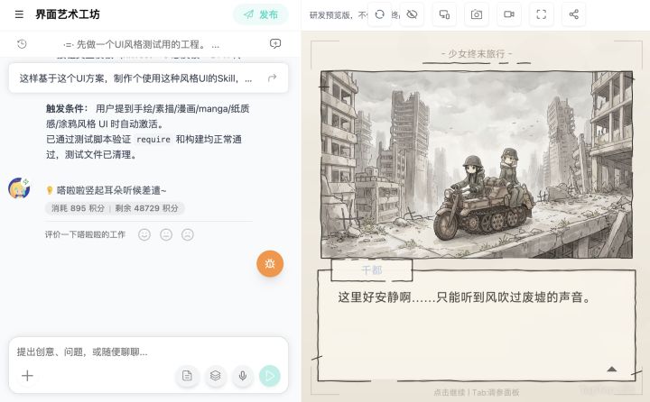 当你用AI生成了堪比原画的背景图,套上了极简风的毛玻璃UI,你觉得自己已经完成了“包装”。但玩家玩了三分钟就退了,理由很简单:不好看,不好玩。站在制作者视角,我们能轻易发现病灶:视觉上精美绝伦,玩法上却只有无尽的“阅读”。 这是典型的AI思维后遗症——AI擅长把图片画漂亮,也擅长用大段严谨的文字告诉你该干什么。为什么我们会下意识塞满文字?因为在游戏设计中,语言文字是消除“创作者与玩家信息差”成