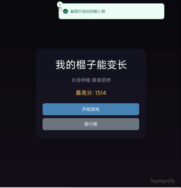 我很清楚告诉他想法。然后他就构架了一个玩法加操作方法。然后生成的游戏我试了试有Bug。棍子落不下去。他很快就找到了问题。然后测试到第四个地点时,没有地点可以落地。提出要求最后就是一些小的细节修改上传发布。总结不足:1.场景单调2.缺少特效3.无转场动画4.没有背景音乐5.无难度曲线:间距始终随机,没有随分数递增的难度变化6.没有成就系统、皮肤解锁等长期目标