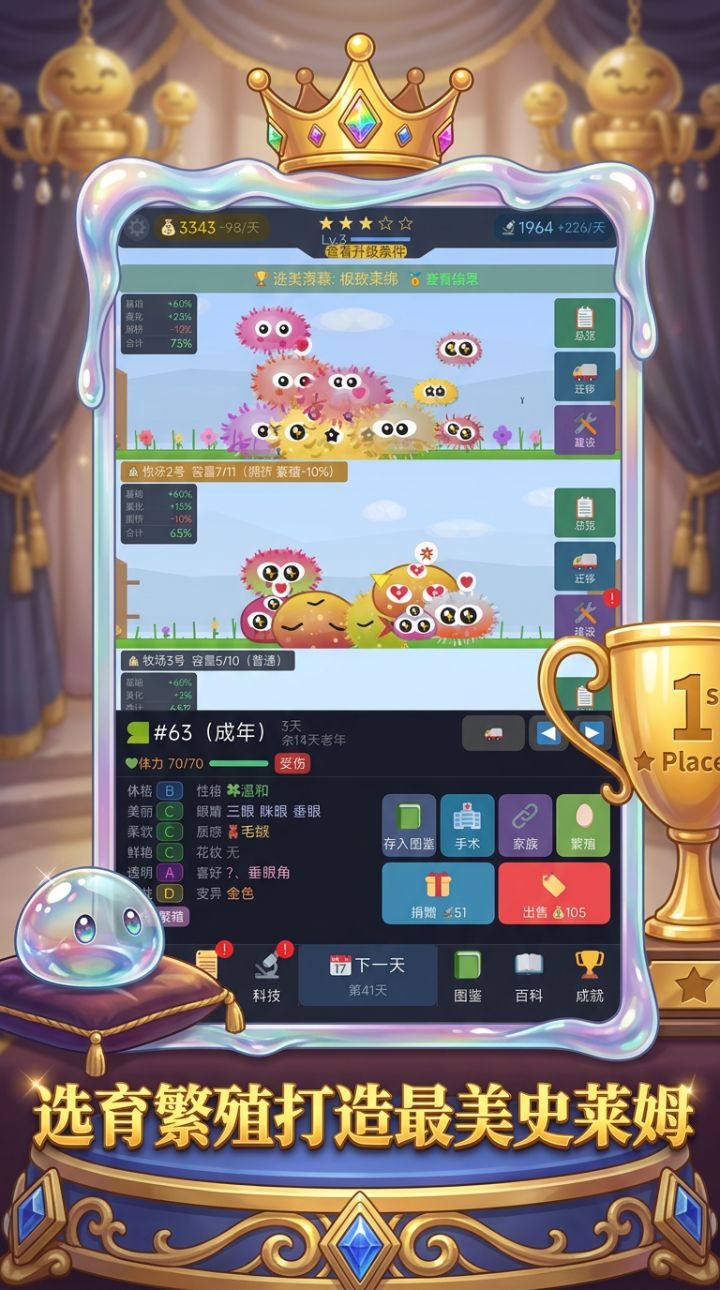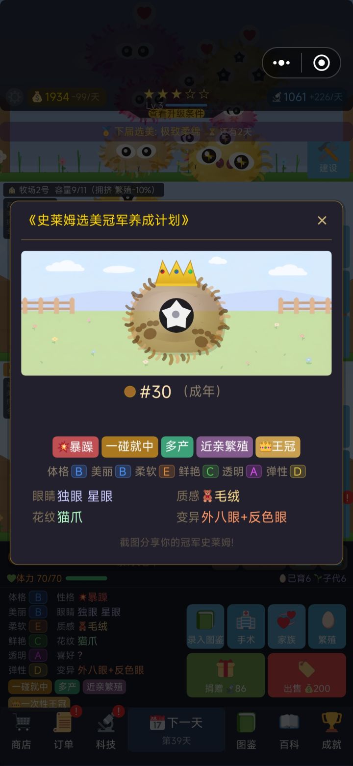 一些碎碎念,不过我个人的游戏喜好还是单机PC为主,所以我的《史莱姆选美冠军养成计划》各方面交互和设计思路非常不手游。图形化的东西很多,并且故意挑战tap maker的美术引擎能力,所以游戏内所有美术确实都是让tap maker自己跑的……后果就是性能问题严重,有种不顾大家手机死活的美玩家卡到闪退,我自己测试时候手机也严重发热……但是我的设计理念就是