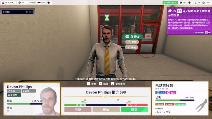全部鉴定完了,会有三个价格,第一个是卖方的销售价格,一个市场预估的价格,以及卖方的心理最低价格,通过砍价结合顾客的反馈,不断修正回收的价格。有了二手商品后,一个是可以把商品放到货架上,还有一个是放到待销售的展示柜中。在游戏中,如果展示柜方的东西都是差不多的物品,还会有连携效果。