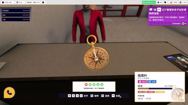 在一切准备妥当,就可以挂牌营业了,会有形形色色的人来卖自己的东西,顾客卖东西会自己自己的东西有一个价格预期,此时需要做的就是先鉴定商品,按照提示对鉴定点都鉴定完,如果是一些古董、老物件,无法做出准确的判断,还可以打电话请求外援。