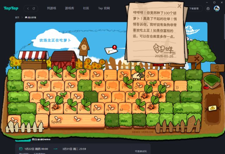 由于功能开启节奏比较慢,并没有尝试解锁全部农场功能,以常规Demo版本来看,估计也是有1-2小时游戏内容的。大部分体验内容是滚键盘种萝卜换钱,开了鱼塘也是增加了资金获取速率。