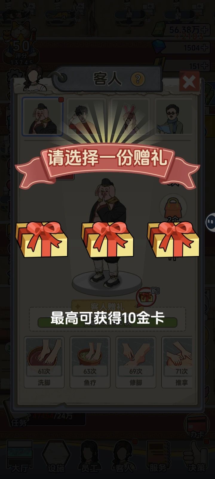 为感谢大家一直以来的热爱与支持,我们特别准备了超值福利大放送!现在参与评论互动,就有机会赢取超级大奖!惊喜奖品:钞票*88888、钻石*388(共100份)参与方式:在本帖评论区中留言互动,即可参与抽奖喔!开奖方式:开奖时间到后,将从评论区中随机抽取100名幸运玩家赠送(采用TapTap自动抽奖方式)礼包码兑换步骤:进入《开个洗脚店》游戏→点击设置→输入礼包码→点击兑换