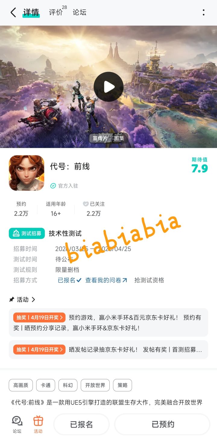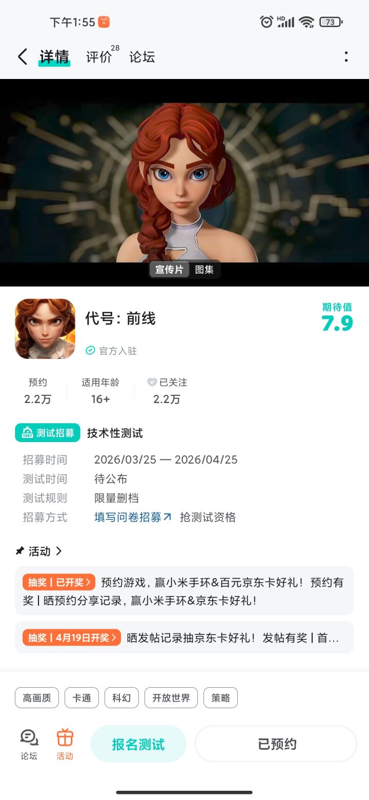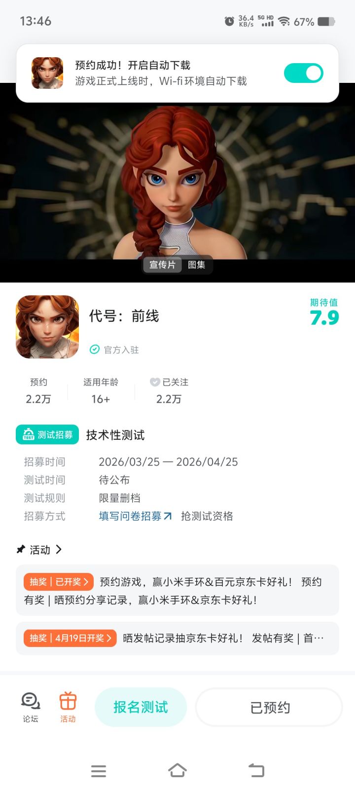 亲爱的征服者:《代号:前线》预约通道现已开启,征服者的每一份关注和支持都对我们都至关重要!感谢您的支持,我们也特意为各位准备了预约好礼,即日起预约游戏,并在评论区晒出分享截图,将有机会获得小米手环、京东卡好礼! 【活动时间】2026年3月20日 - 2026年4月19日 【参与方式】第一步:在Taptap平台搜索《代号:前线》,或点击下方链接进入游戏详情页,点击“预约”按钮;第二