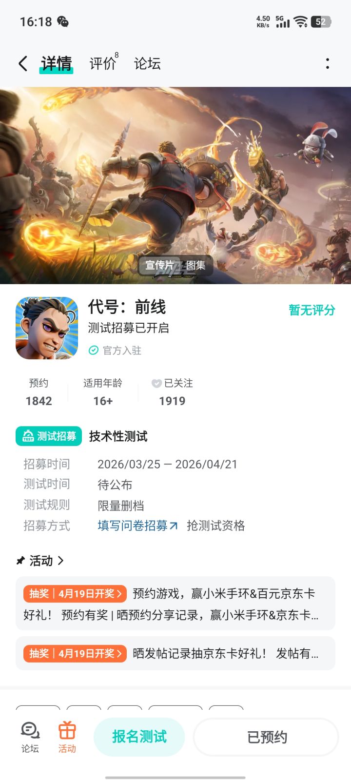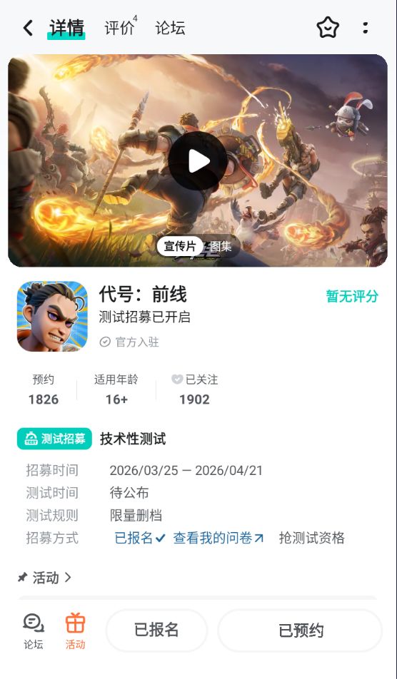 [图片]亲爱的征服者: 《代号:前线》「技术性测试」招募现已开启!即刻填写* 《代号:前线》测试招募问卷,将有机会获得本次测试资格。 【测试信息】 测试平台:仅支持安卓系统手机端(不包含纯血鸿蒙系统及模拟器) 测试形式:限量删档不计费测试 设备要求:因前期技术适配要求,仅能开放RAM>6G且处理器型号符合要求的手机型号,请如实填写您的真实设备信息,避免无法顺利进入测试。 【如何获取测试资格】 本次测试资格,将通过填写招募问卷的方式进行抽取。 点击填写问卷:* 《代号:前线》测试招募问卷 填写时间:即刻起-2026年4月21日 17:00 资格通知时间:2026年4月24日—4月26日陆续发放 测试资格发放:我们将通过TapTap站内信&手机短信&邮件的形式通知获得测试资格的征服者,您问卷填写的手机号将作为参与测试的游戏账号,请务必填写正确。 【注意事项】 1. 本次测试版本为开发中版本,不代表游戏最终品质; 2. 禁止对内测名额的分享或交易行为,一经发现将取消该账号测试资格; 3. 若因运营商短信屏蔽未收到通知,但通过TapTap站内信&邮件的渠道确认获得资格,同样视为有效; 4. 本次测试仅对于18周岁及以上的用户开放,未实名注册或未成年用户将无法参与测试; 5. 本次测试进行报名筛选,请确保您填写的信息真实有效,若有作假行为,将被取消参与资格。 ———————————————————————————————————— 更多资讯请加入官方 QQ 群:1033302088 游戏首测预约现已开启,点击预约即可领取首测福利! 来自TapTap[ID:106994427 探险家:小玥]