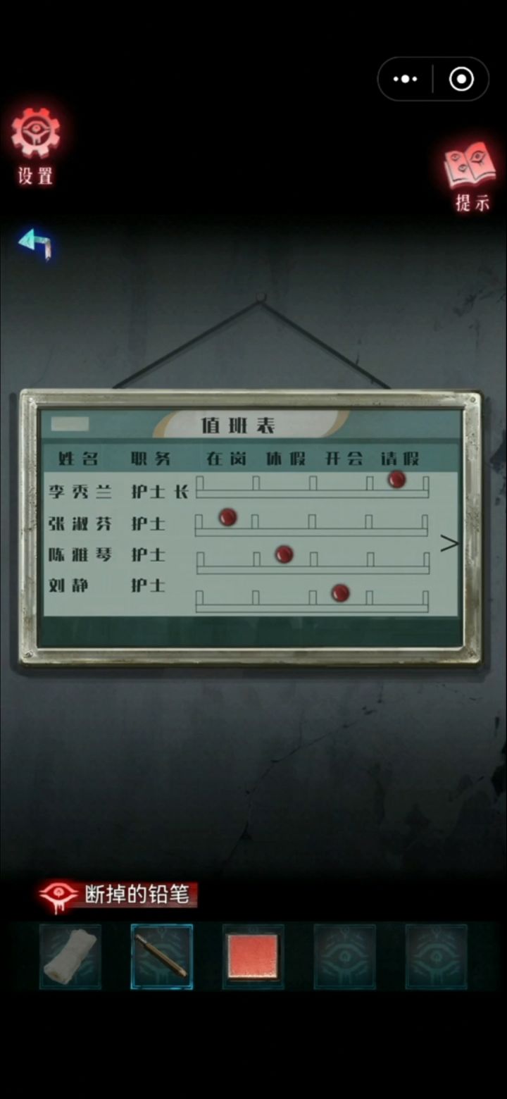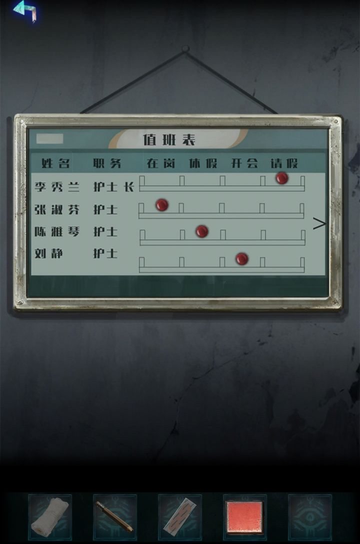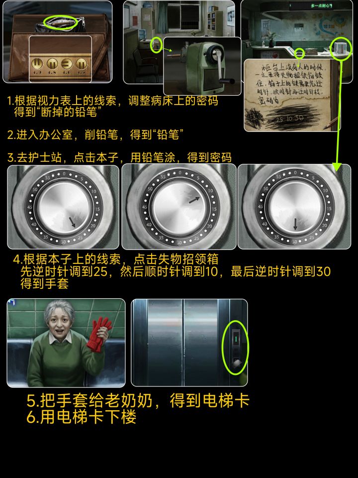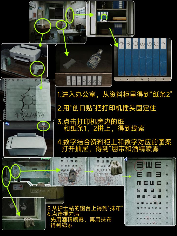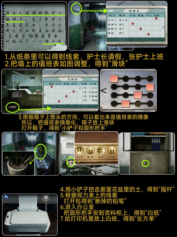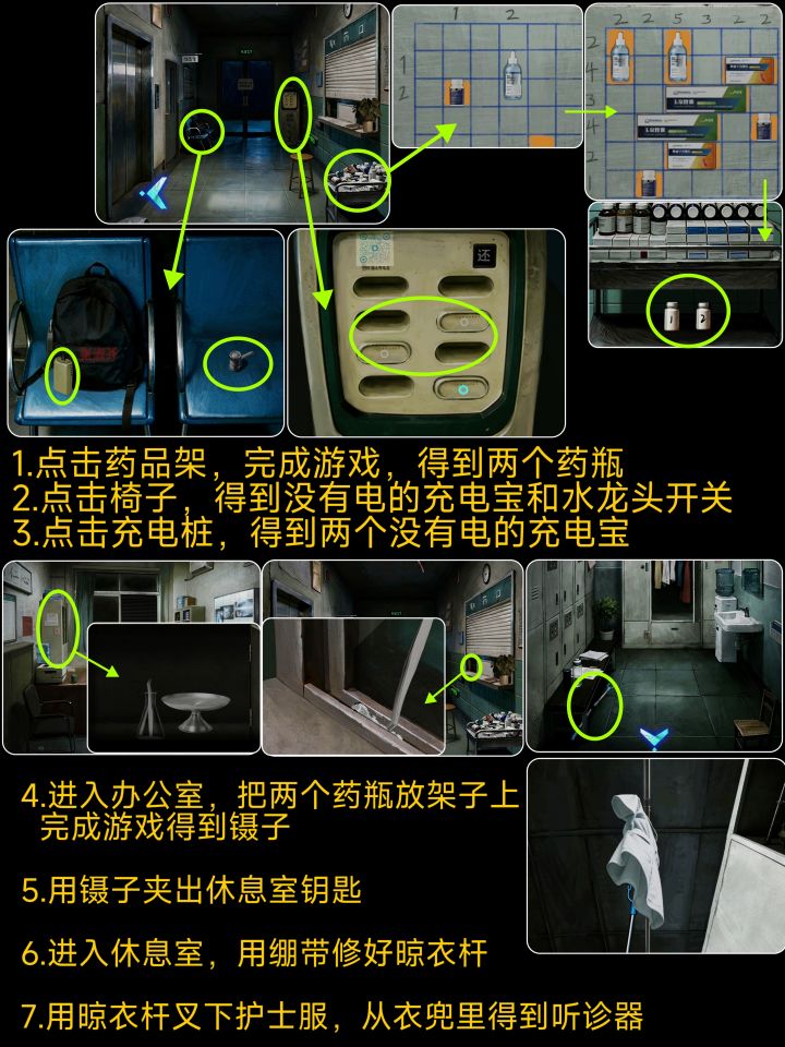 1.急救箱和玩偶拼835开柜子2.462开图片3.护士站前面箱子去看排班表得跟v同一方向23414.纸条拼起桌子丢三落四4724545.病房箱子看视力表6.失物招领逆顺逆2510307.中间两排不能点从左到右3152468.紫灯照衣服2463159.休息室左下角柜子不知道的下面问吧
