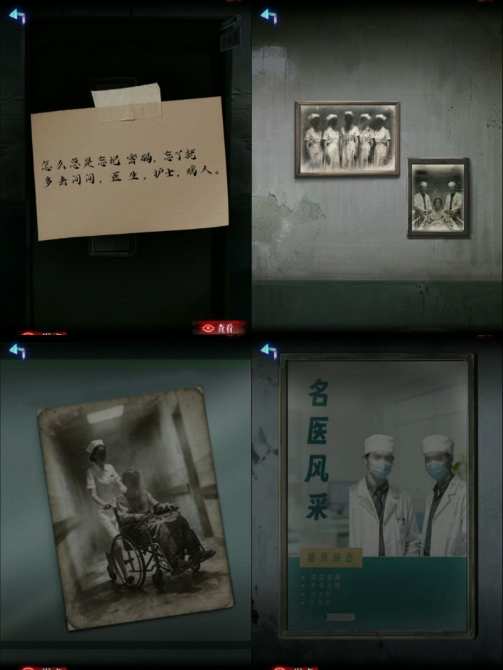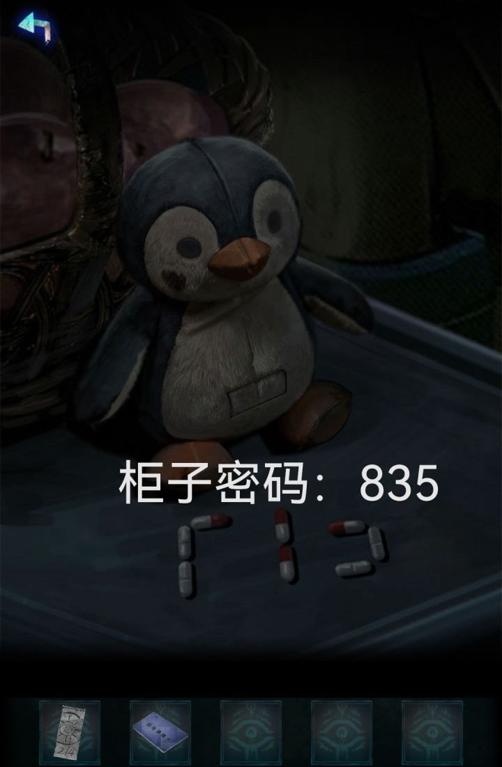根据提示打开左边床的床头柜拿到电池 给小企鹅装上 听妈妈的语音 要去拿药但是门锁住了垃圾桶里获得纸条1根据小企鹅前面的胶囊和左边床上方药箱里的胶囊结合得出小企鹅床头柜密码835获得医保卡 用医保卡开门走廊长凳上获得发卡根据办公室门上纸条提示 查看病房内墙上的合照和走廊两侧墙上的照片 得出办公室门锁密码462在办公室右边书柜第二层获得纸条2两张纸条和左边打印机的桌上的半张药方拼在一起获得