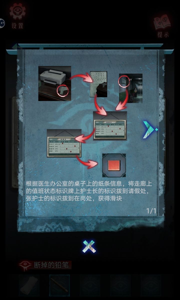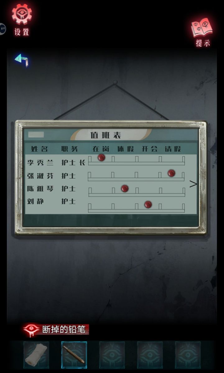 1.急救箱和玩偶拼835开柜子2.462开图片3.护士站前面箱子去看排班表得跟v同一方向23414.纸条拼起桌子丢三落四4724545.病房箱子看视力表6.失物招领逆顺逆2510307.中间两排不能点从左到右3152468.紫灯照衣服2463159.休息室左下角柜子不知道的下面问吧