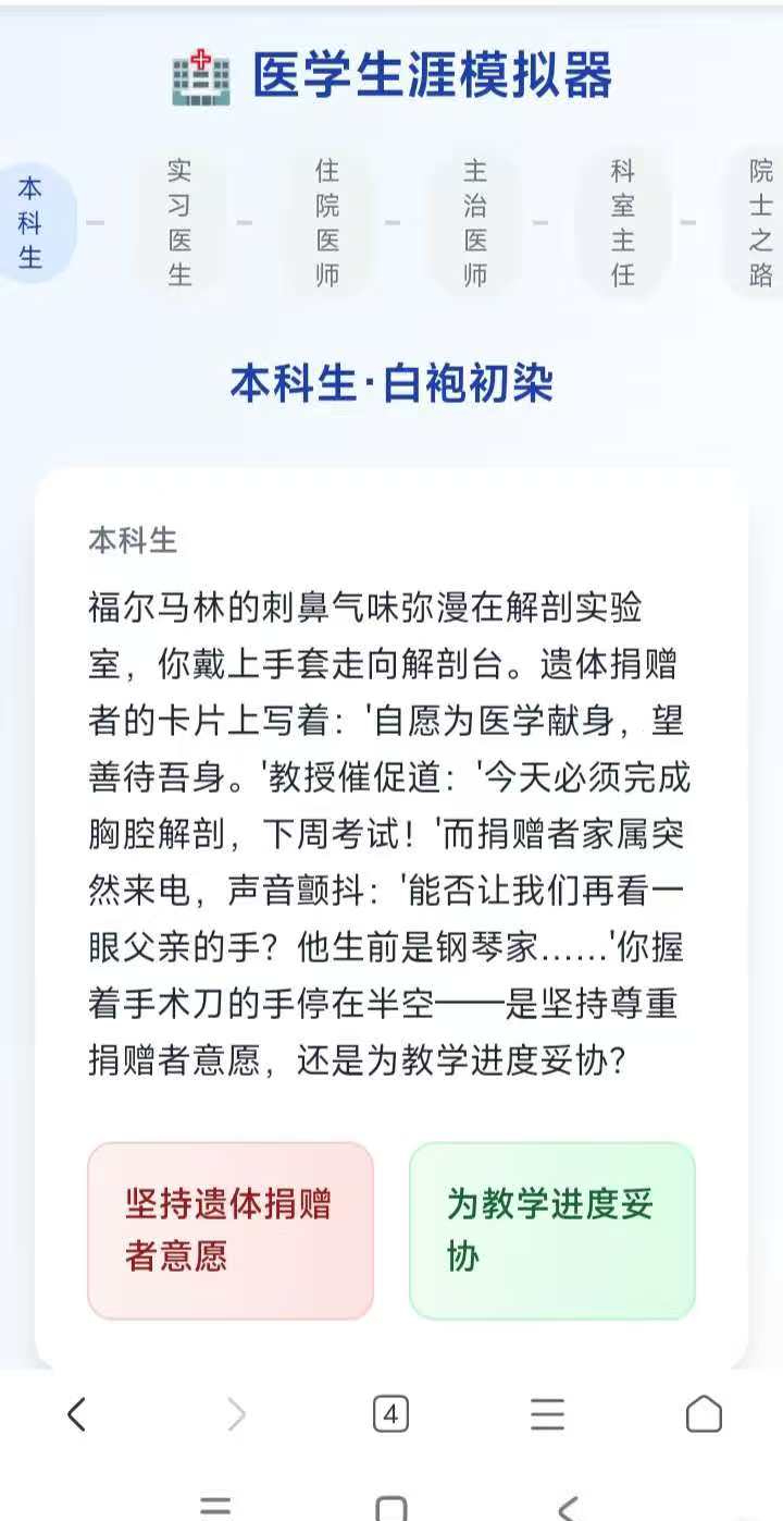 从白袍初染到医学巅峰的传奇之路,每个选择都将塑造你的医学人生。开发者其一从临床医学专业毕业,一些题目来自于本科和研究生生涯中正在经历或者有所耳闻的故事。但毕竟是游戏,题目有艺术演绎,不能对标真实世界中的困难和选择。