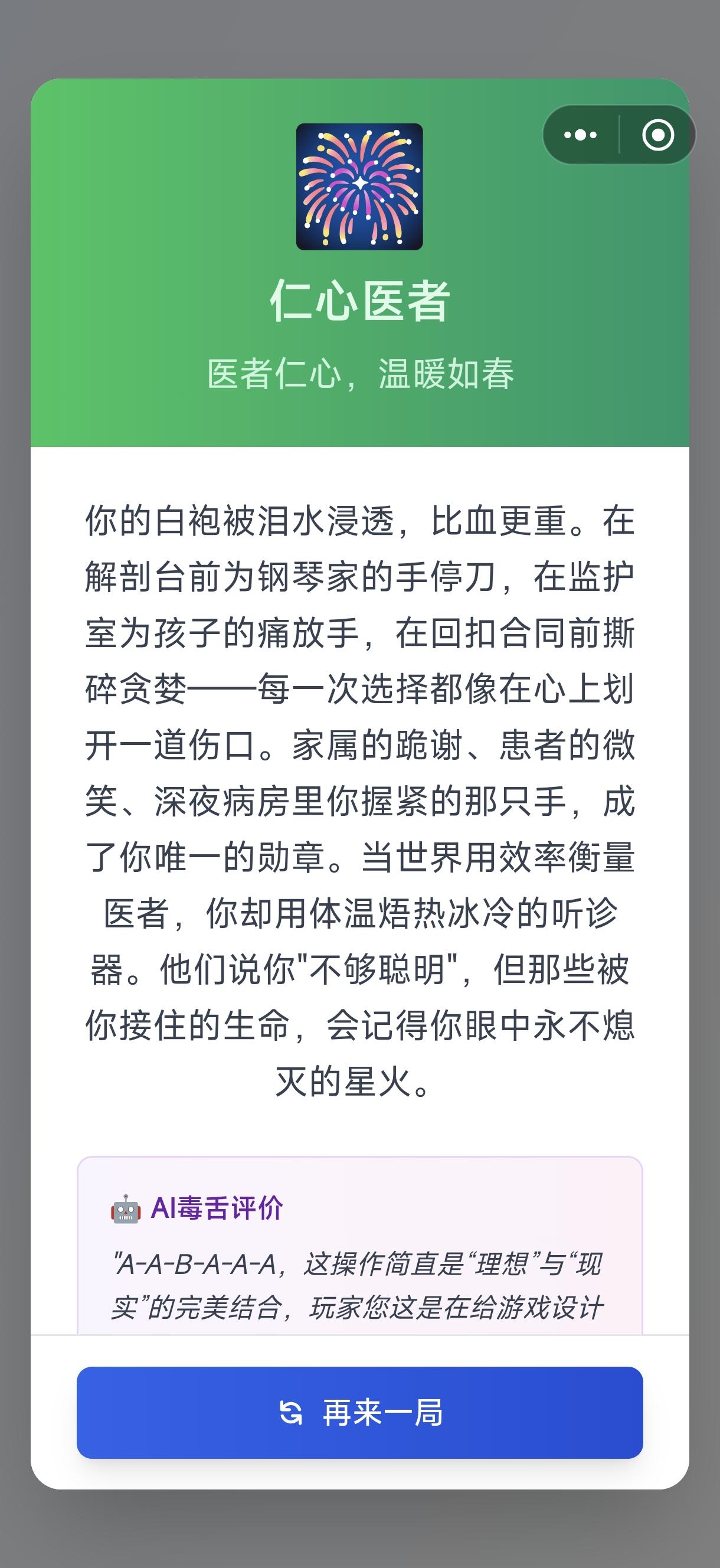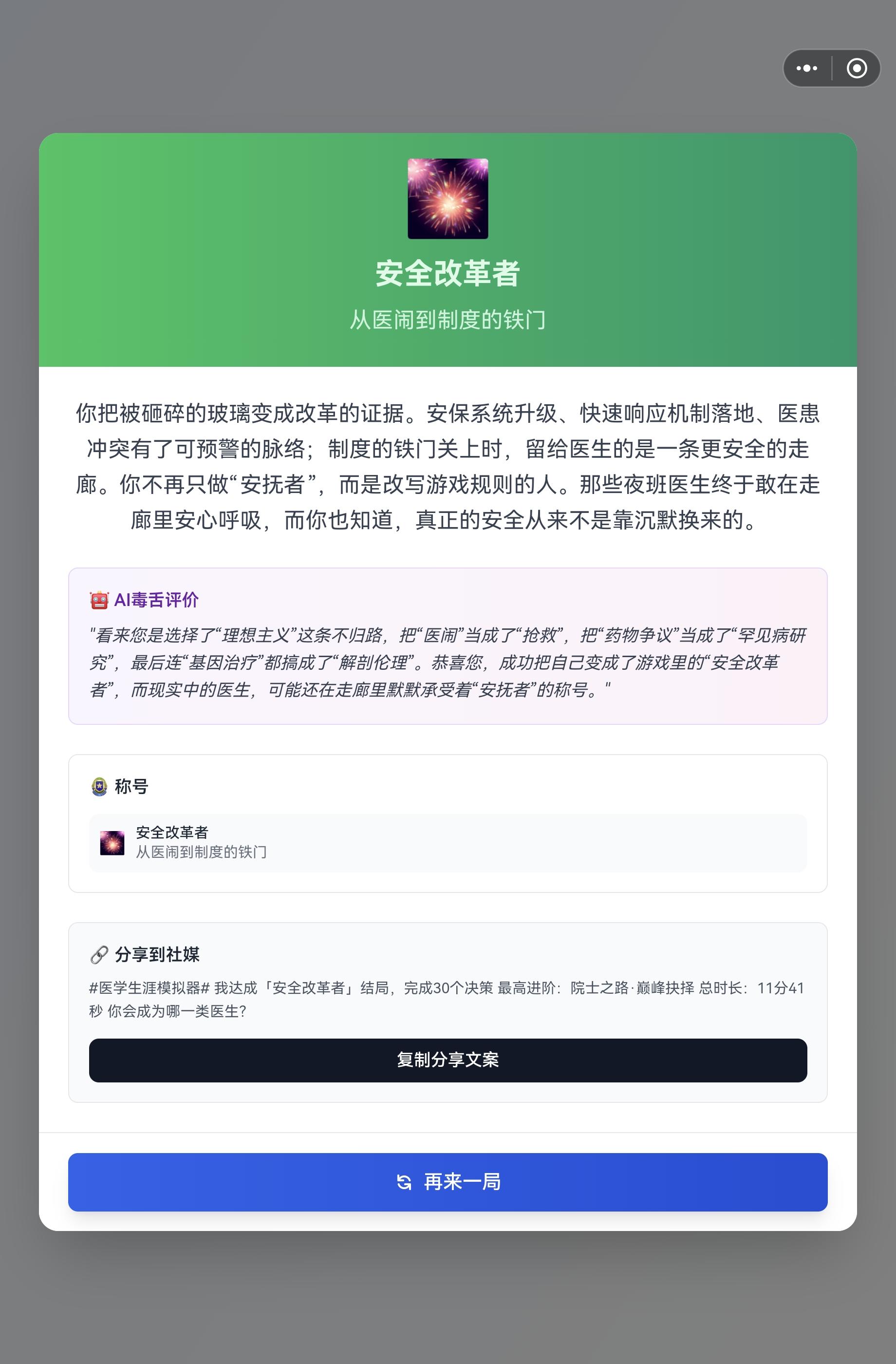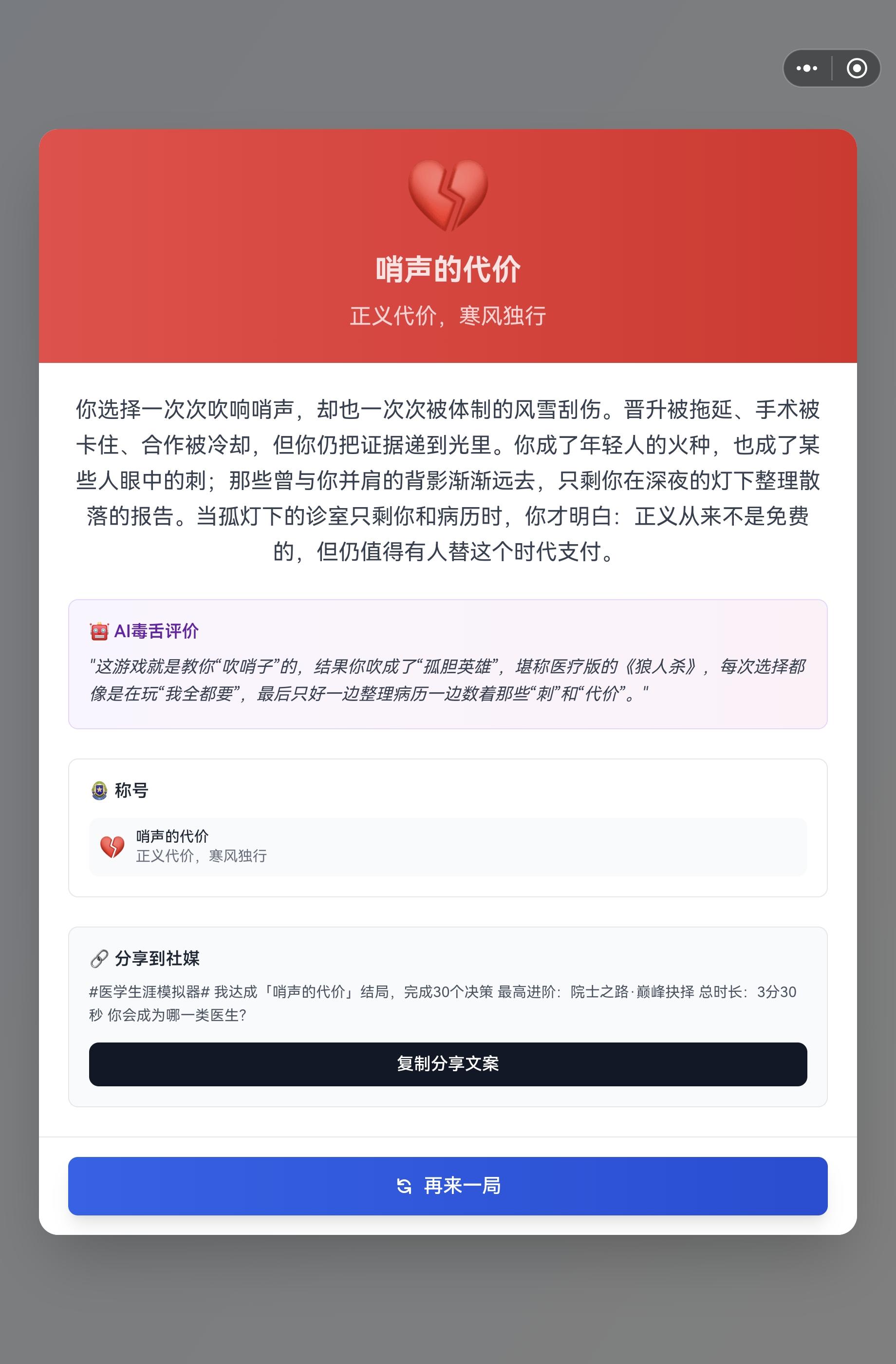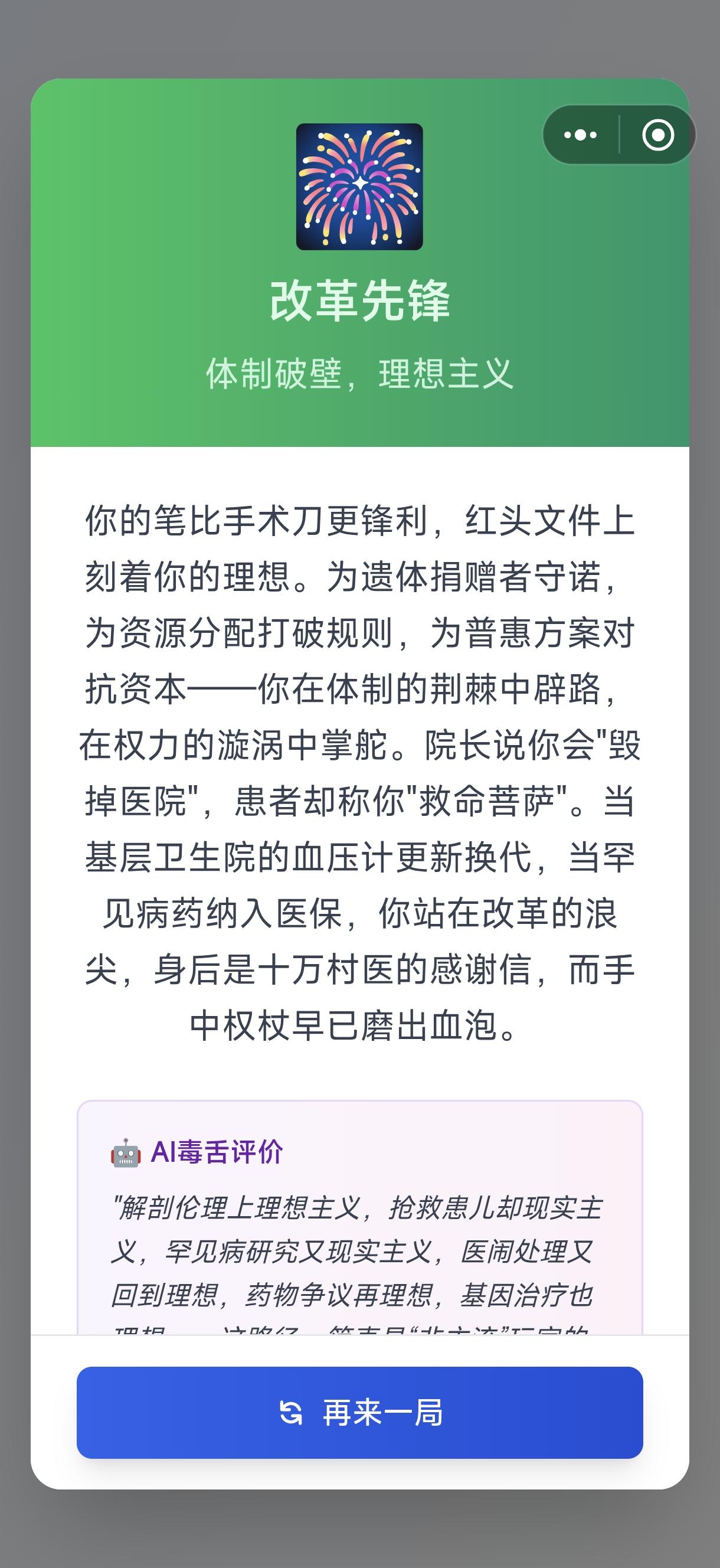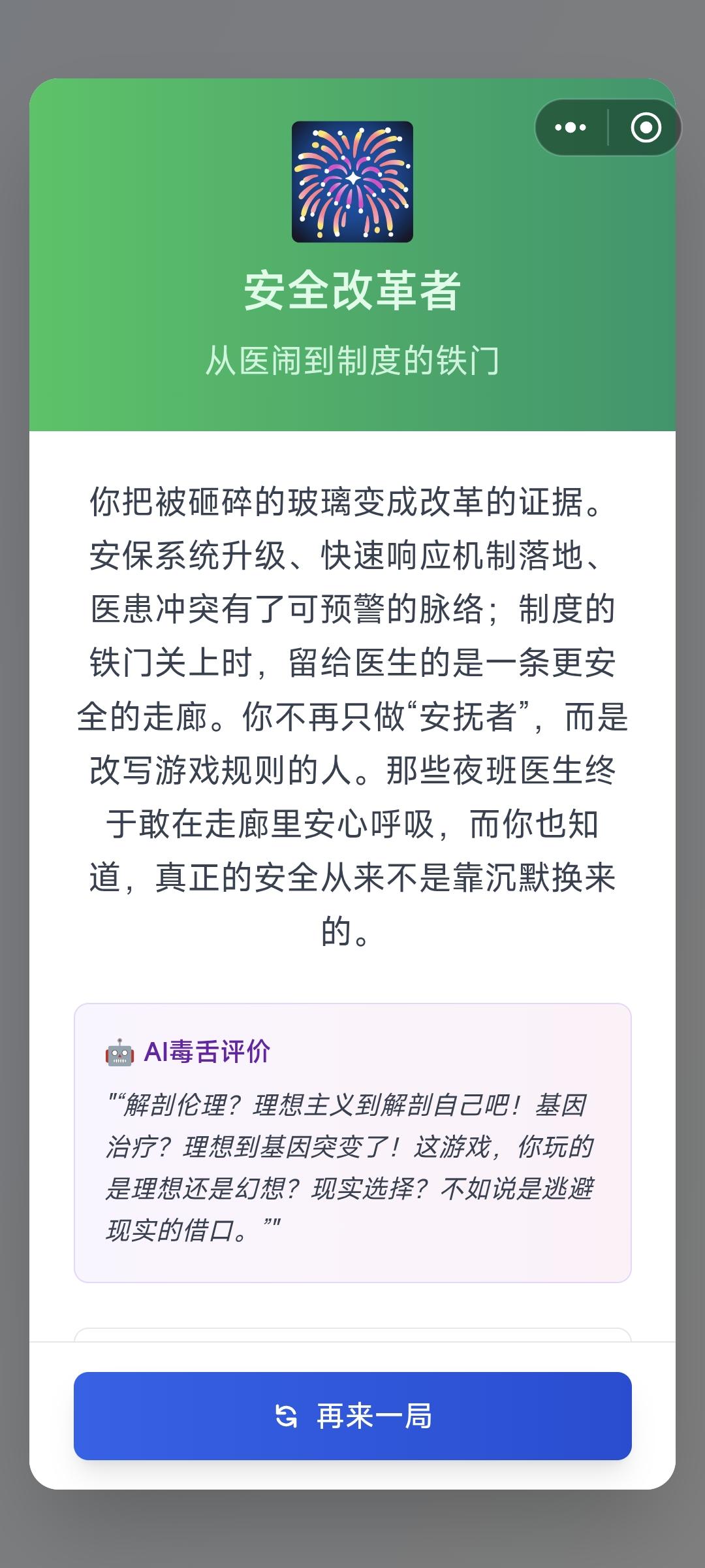 : 可能真的是体制内的都会是这个结局😂我也是这个,虽然我是警察,不过我很喜欢医学,本来的梦想也是做个医生,可惜命运阴差阳错成为了警察,不过依旧对这个职业抱有热情,没想到不是自己想的医者仁心,居然是这个更“政治化”的结局已经到底了