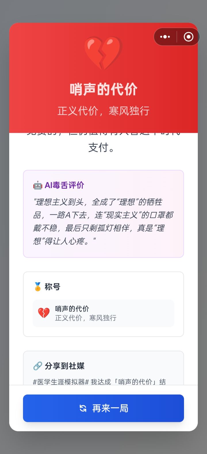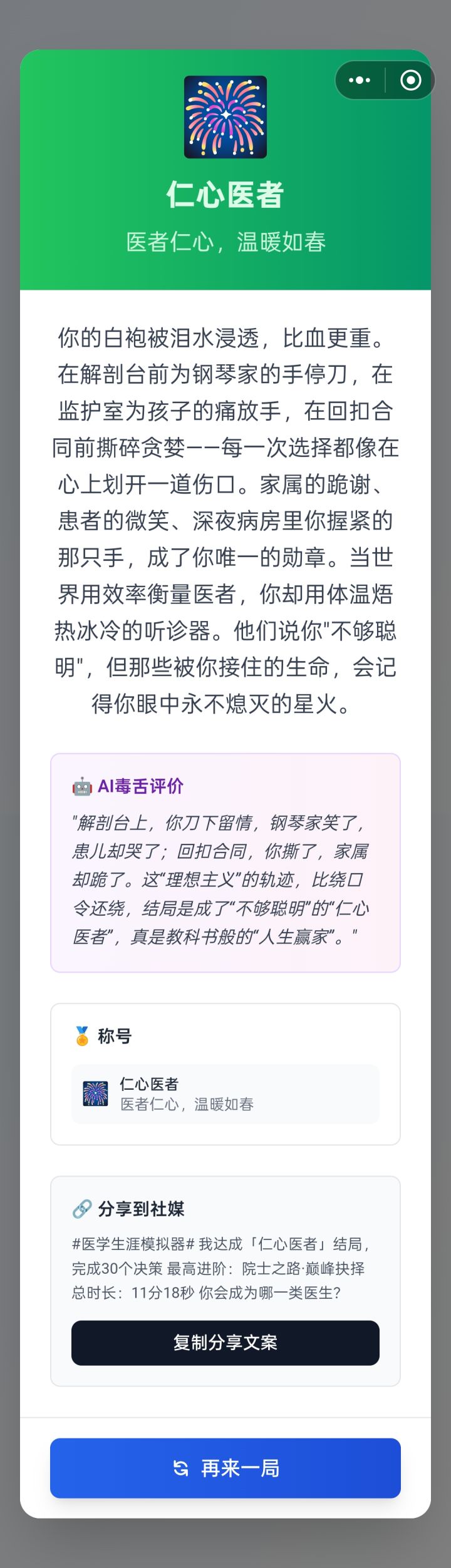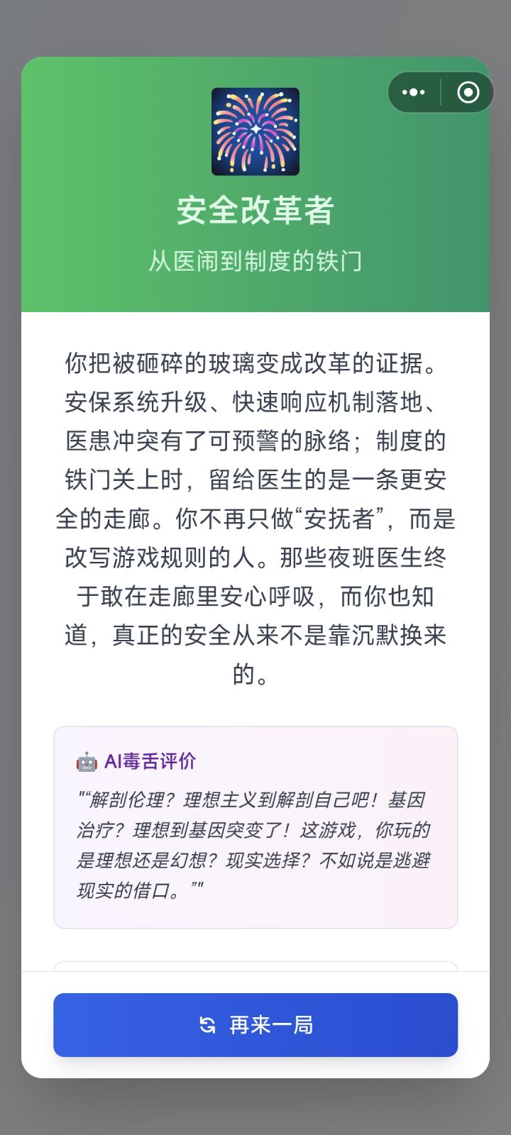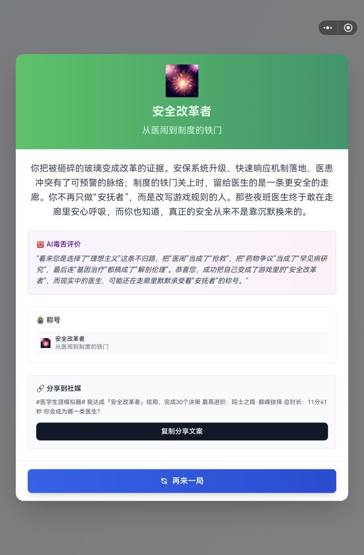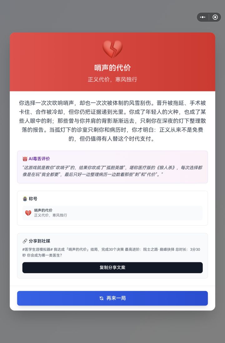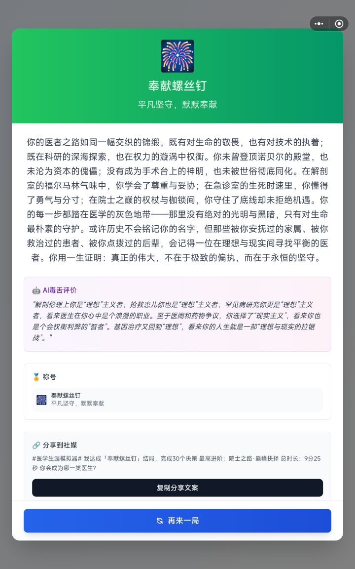 : 可能真的是体制内的都会是这个结局😂我也是这个,虽然我是警察,不过我很喜欢医学,本来的梦想也是做个医生,可惜命运阴差阳错成为了警察,不过依旧对这个职业抱有热情,没想到不是自己想的医者仁心,居然是这个更“政治化”的结局