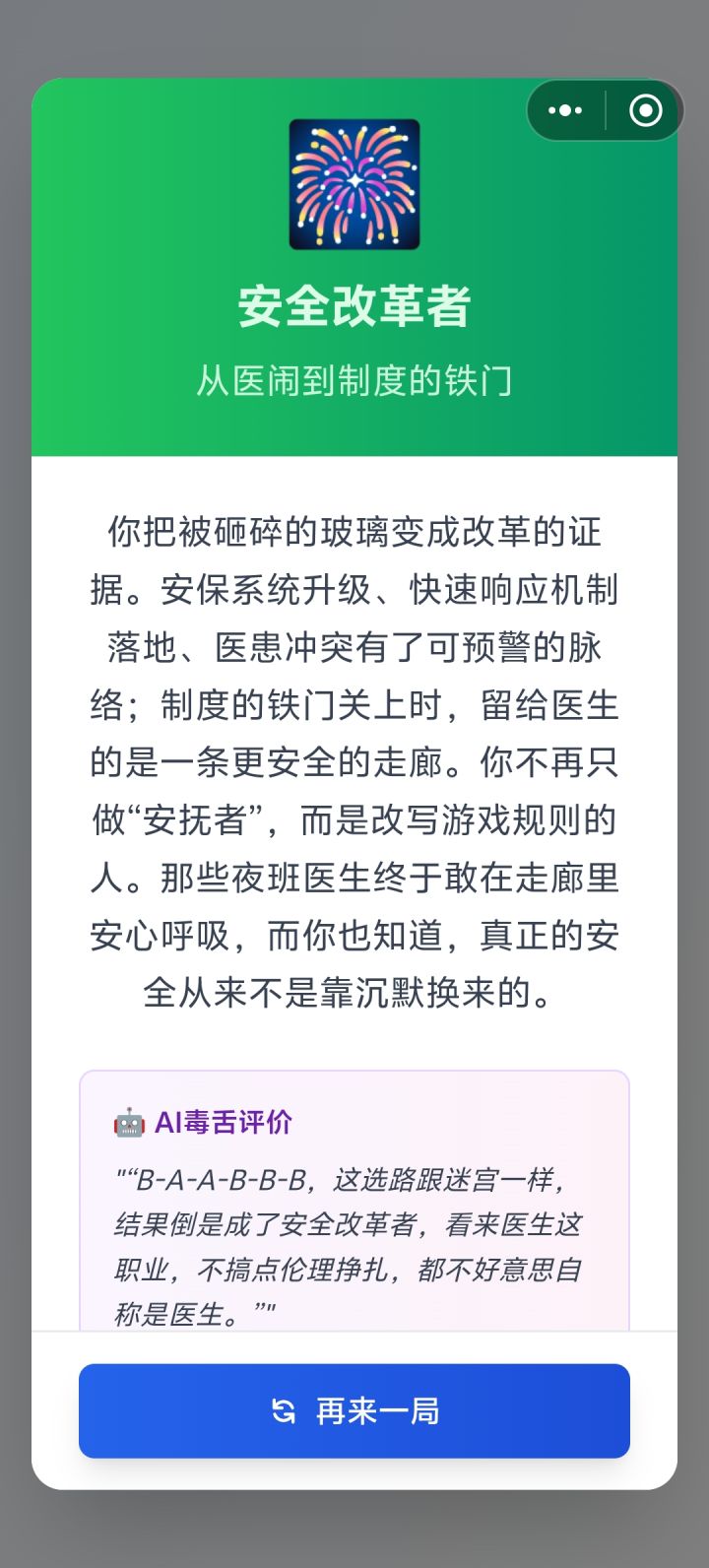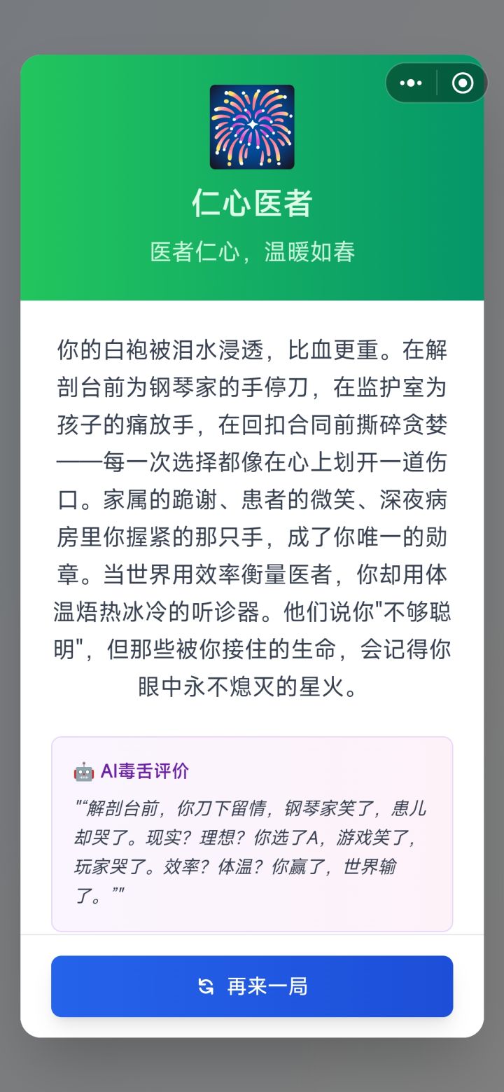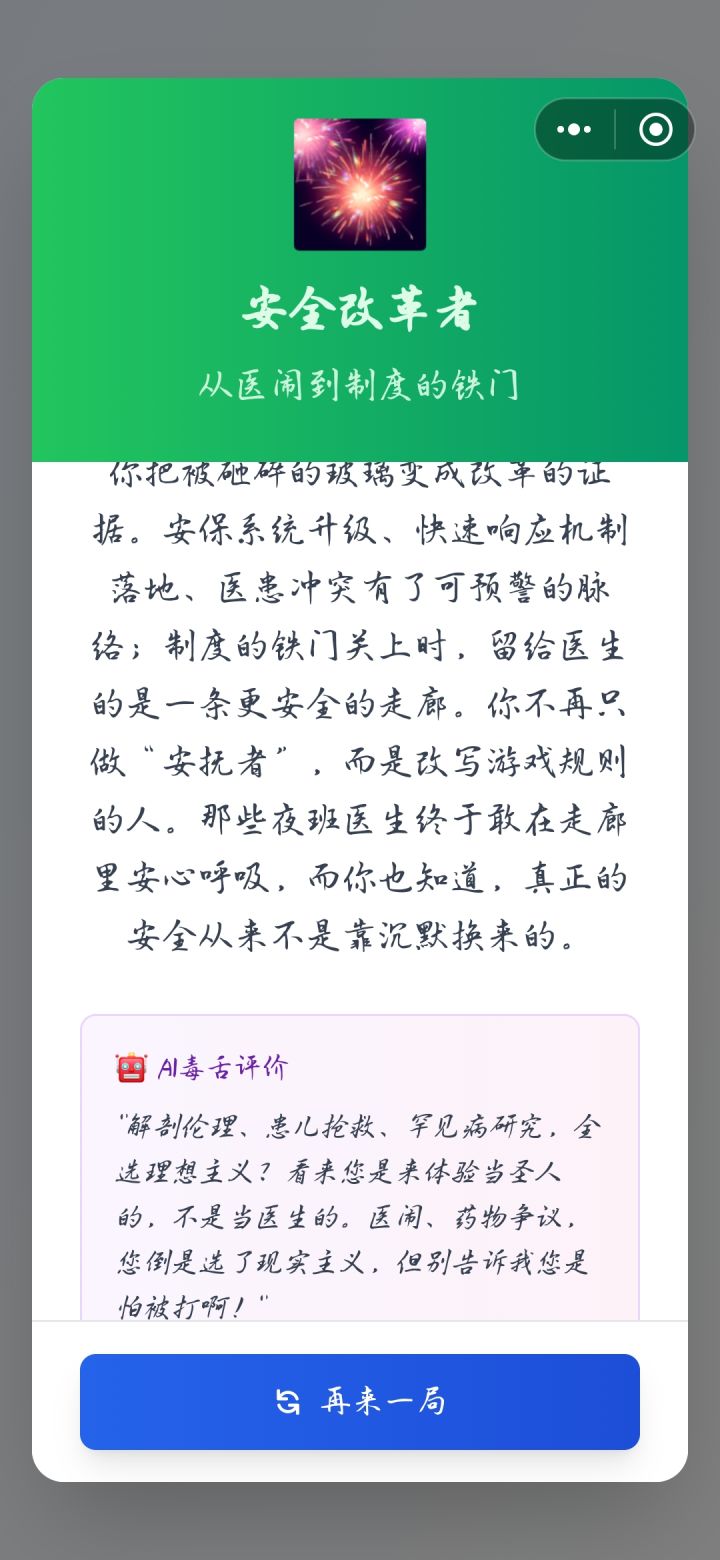 💔 哨声的代价 正义代价,寒风独行 你选择一次次吹响哨声,却也一次次被体制的风雪刮伤。晋升被拖延、手术被卡住、合作被冷却,但你仍把证据递到光里。你成了年轻人的火种,也成了某些人眼中的刺;那些曾与你并肩的背影渐渐远去,只剩你在深夜的灯下整理散落的报告。当孤灯下的诊室只剩你和病历时,你才明白:正义从来不是免费的,但仍值得有人替这个时代支付。 🤖 AI毒舌评价 "“选择A-A-A-A-A-A,果然是理想