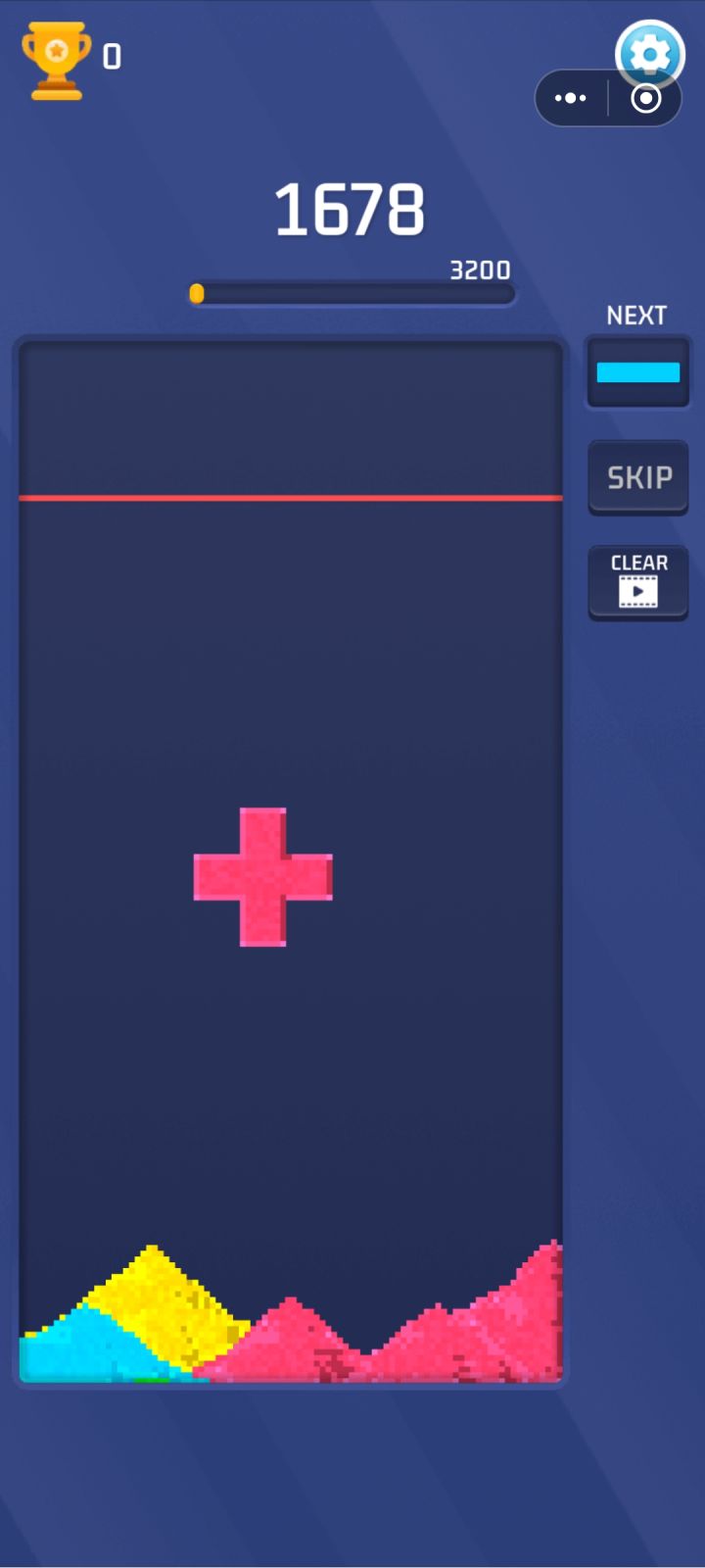 创意工坊的休闲小游戏,流沙俄罗斯方块玩法很早就有,这里几乎是完全照搬了过来。稍有不同之处在于新加了两个功能:skip和clear,前者可以更换当前方块,有一些免费次数,用光之后要看广告;后者可以清除下方堆积的沙子,需要看广告才能使用的功能。目前并未实际接入广告,功能可以随便用,但广告设计意图已有。
