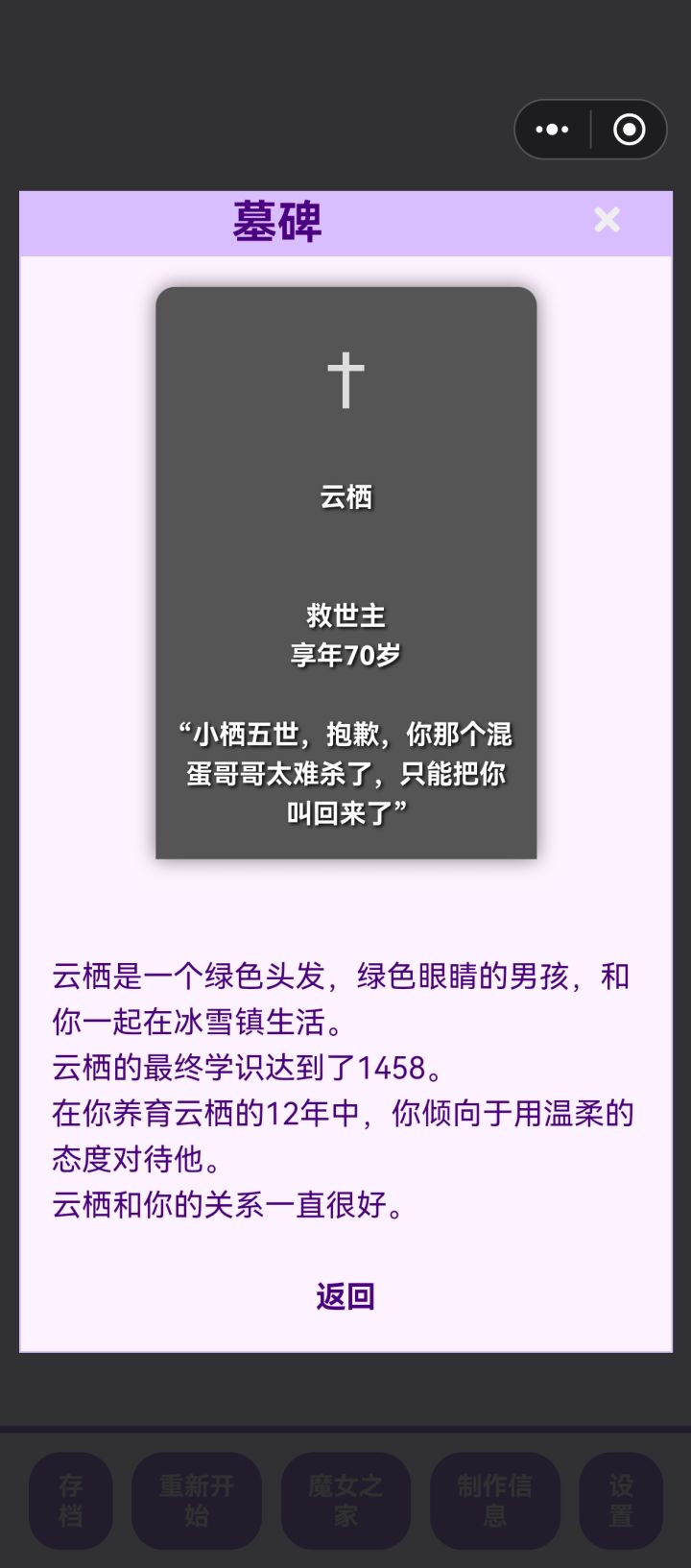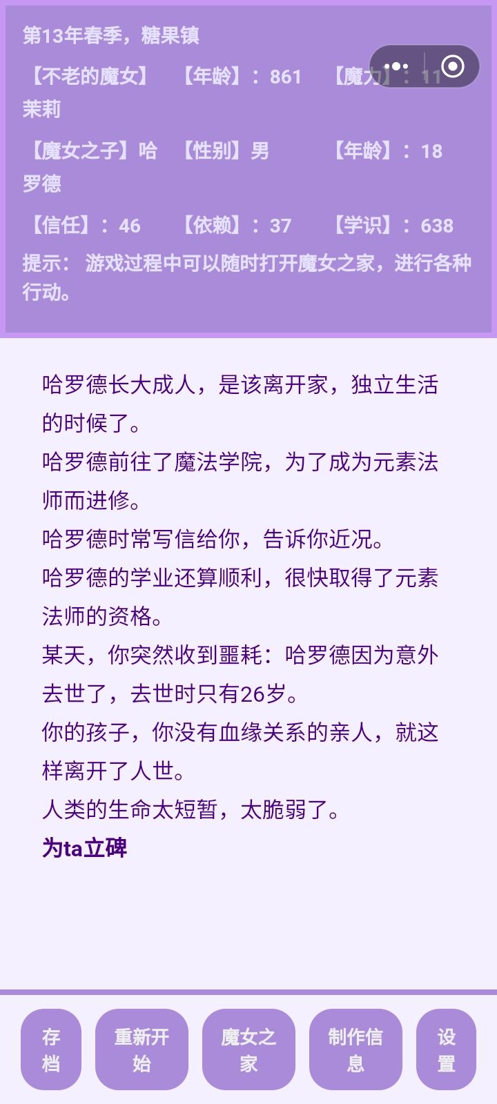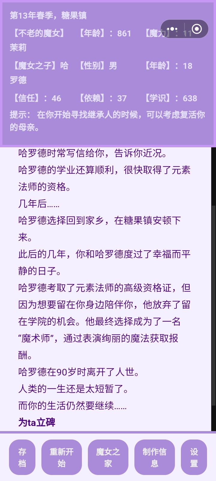 前因是我想看看魔族孩子往坏的一面养会变成什么样,结果忘记存档了。。。导致这孩子变成了一个大坏蛋于是我培养了一个勇者女儿试图让她杀死大魔王儿子,但是第一世她没得早,我就用了瓶复活药,结果才发现她天资没有魔王高,被魔反杀了最后有点没招了,只好把天赋最高的孩子复活,让他帮忙杀死了魔王儿子。。。