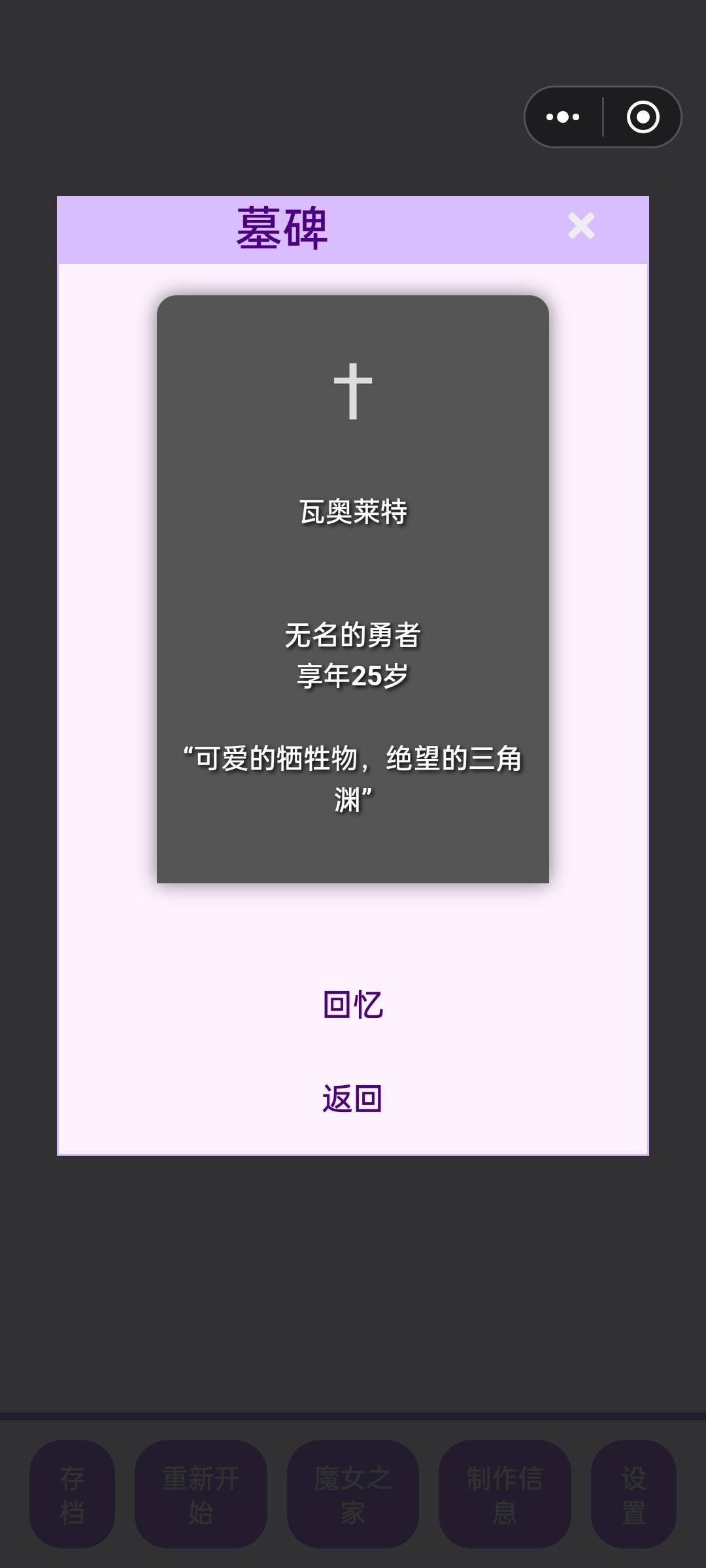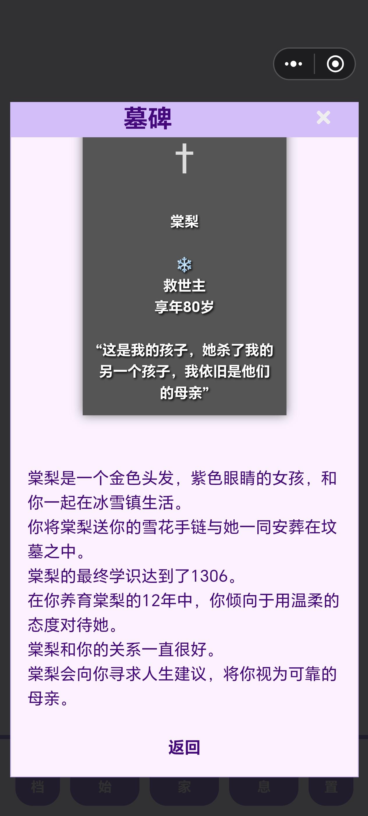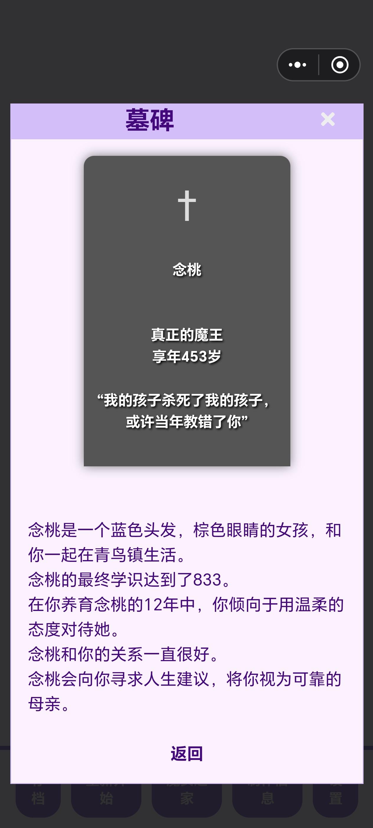 前因是我想看看魔族孩子往坏的一面养会变成什么样,结果忘记存档了。。。导致这孩子变成了一个大坏蛋于是我培养了一个勇者女儿试图让她杀死大魔王儿子,但是第一世她没得早,我就用了瓶复活药,结果才发现她天资没有魔王高,被魔反杀了最后有点没招了,只好把天赋最高的孩子复活,让他帮忙杀死了魔王儿子。。。