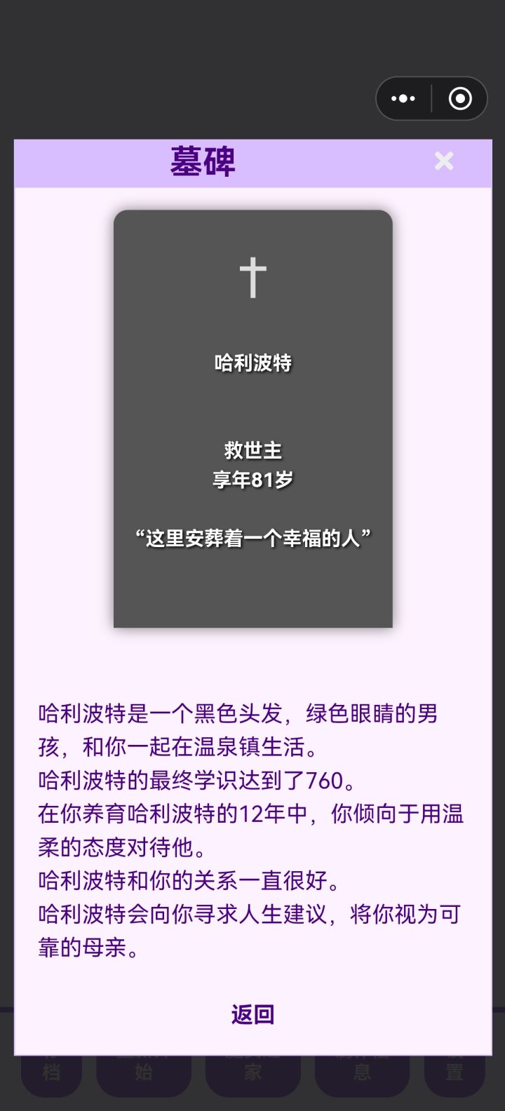 P1:我的一周目墓碑;P2:刚开始以为严厉就能让孩子学有所成,第一个女儿和第二个儿子都全点严厉了,结果孩子跟我一点也不亲,最后的人生既不成功也不快乐,女儿不敢打,但儿子叛逆期直接揍了一顿,感觉我给他们带来了严重的童年创伤,超级对不起他们;P3:等魔力值提高、后来的孩子全点温柔也能把学识堆到三四百,才意识到,不是我的孩子们不争气,是我这个妈妈太没用了(꒦ິ^꒦ິ),于是把我的第一个孩子复活,全点