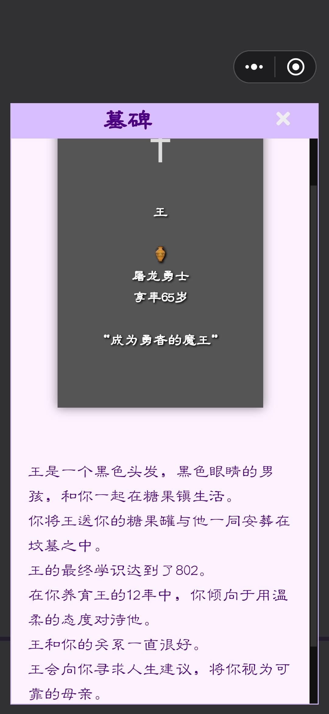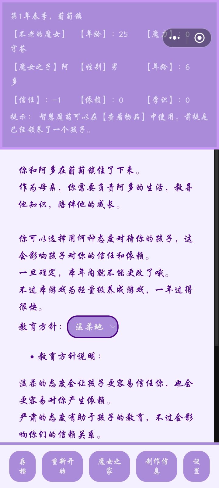 前因是我想看看魔族孩子往坏的一面养会变成什么样,结果忘记存档了。。。导致这孩子变成了一个大坏蛋于是我培养了一个勇者女儿试图让她杀死大魔王儿子,但是第一世她没得早,我就用了瓶复活药,结果才发现她天资没有魔王高,被魔反杀了最后有点没招了,只好把天赋最高的孩子复活,让他帮忙杀死了魔王儿子。。。