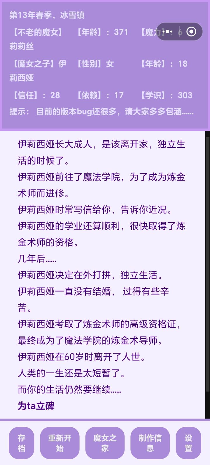前因是我想看看魔族孩子往坏的一面养会变成什么样,结果忘记存档了。。。导致这孩子变成了一个大坏蛋于是我培养了一个勇者女儿试图让她杀死大魔王儿子,但是第一世她没得早,我就用了瓶复活药,结果才发现她天资没有魔王高,被魔反杀了最后有点没招了,只好把天赋最高的孩子复活,让他帮忙杀死了魔王儿子。。。