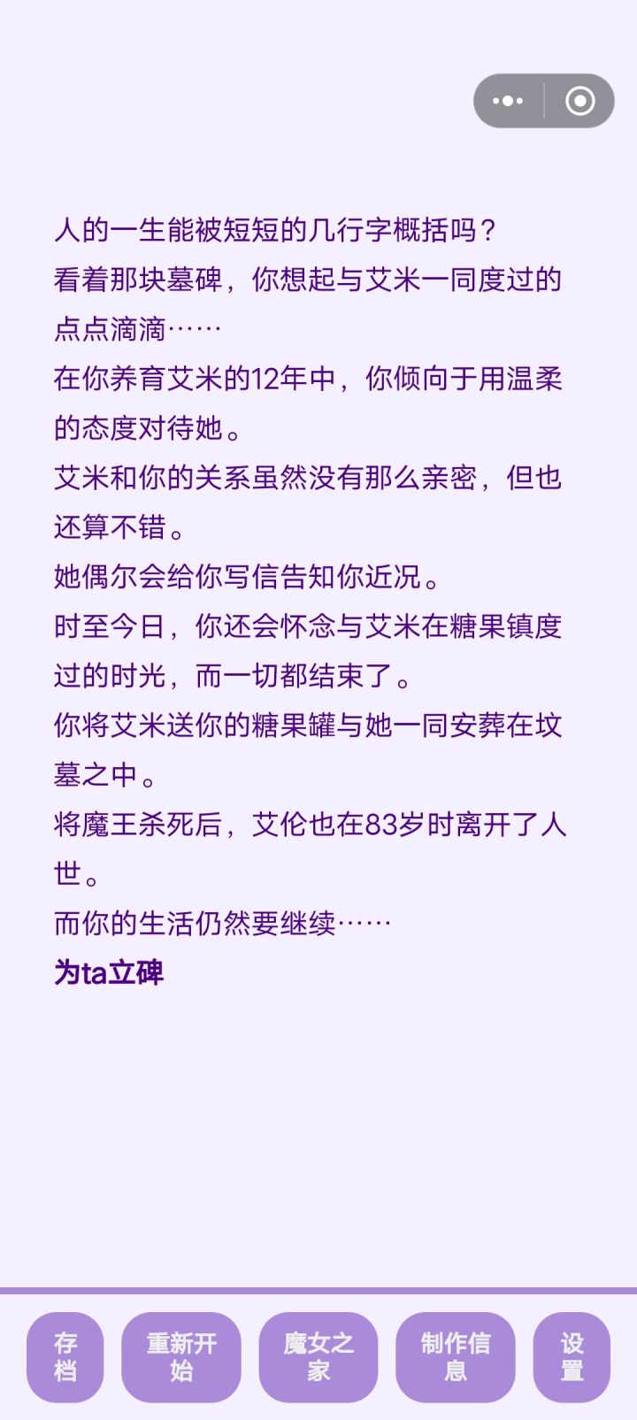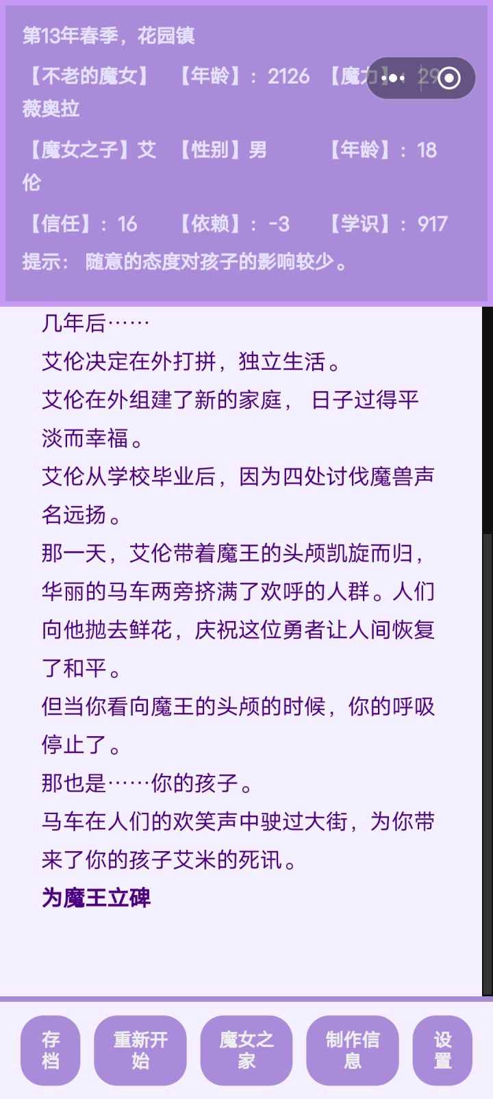 前因是我想看看魔族孩子往坏的一面养会变成什么样,结果忘记存档了。。。导致这孩子变成了一个大坏蛋于是我培养了一个勇者女儿试图让她杀死大魔王儿子,但是第一世她没得早,我就用了瓶复活药,结果才发现她天资没有魔王高,被魔反杀了最后有点没招了,只好把天赋最高的孩子复活,让他帮忙杀死了魔王儿子。。。