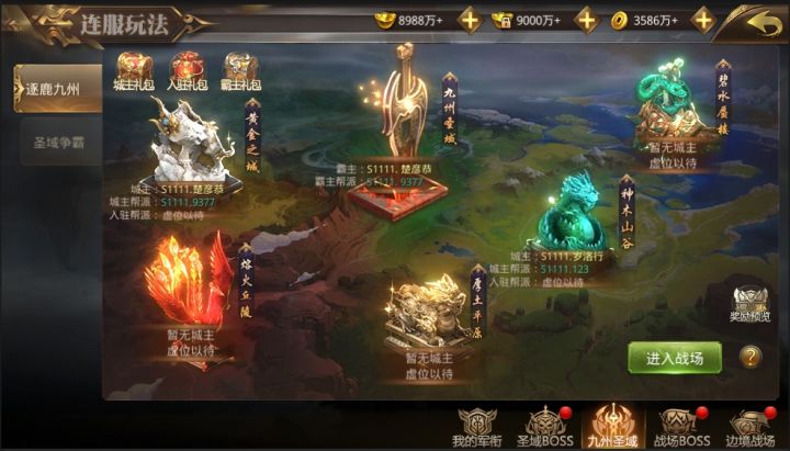 1、逐鹿九州开启条件1)开服35天且角色300级开启;2)每周六20:30开启活动;3)主界面【连服】进入。奖励预览1)占领奖励:专属城主称号、人级战誉令*50、高级命格魂石*10、初级光环经验丹*25、升阶材料锦囊*25、天罡觉醒秘籍宝箱*102)参与奖励:人级战誉令*30、高级命格魂石*5、初级光环经验丹*12、升阶材料锦囊*12、天罡觉醒秘籍宝箱*63)霸主礼包:人级战誉令*