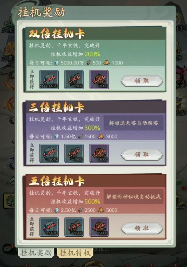 一、挂机特权:免费优先,小氪选5倍2倍挂机特权解锁条件:通关1000关(第一天可完成)。收益:挂机收益+200%。3倍挂机特权解锁条件:通天塔1000层(第一天可完成)。收益:挂机收益+300%,解锁通天塔自动爬塔。5倍挂机特权解锁条件:需达到元婴境界(耗时较长)。收益:挂机收益+500%,解锁封神秘境自动挑战。建议:小氪可直接购买,平民玩家可随境界提升自然解锁。总结:2倍、