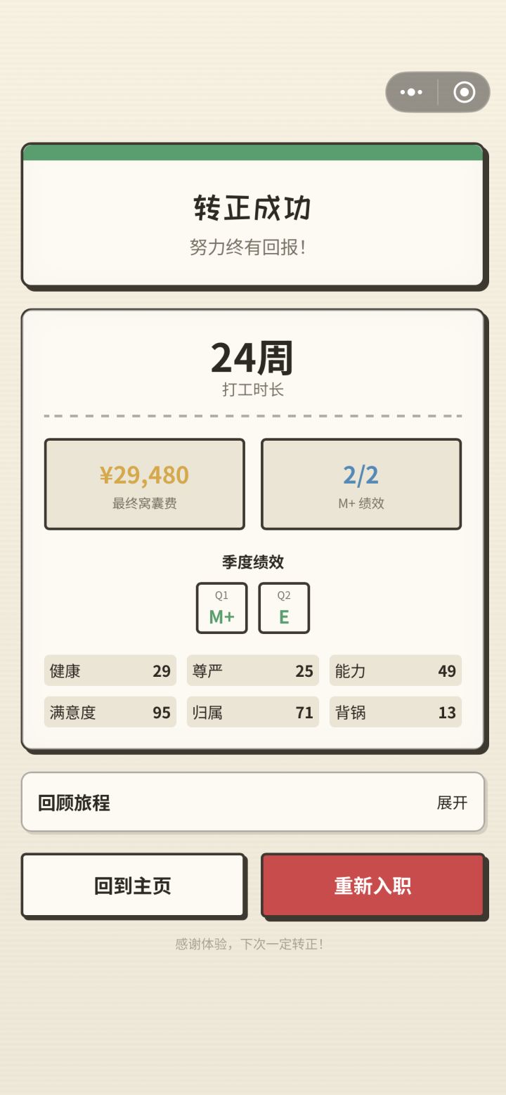 #大厂外包模拟器 能力大于40 满意度尽量在大于96左右,归属大于70,在开会和右下角类似于休息的来回按健康不要低,我是根据评论区一位老师发的文玩的