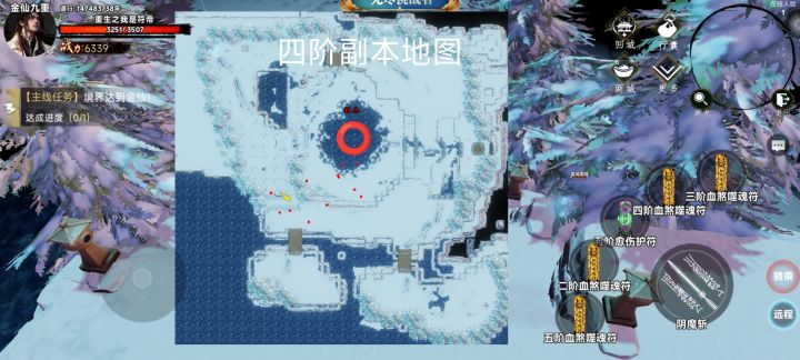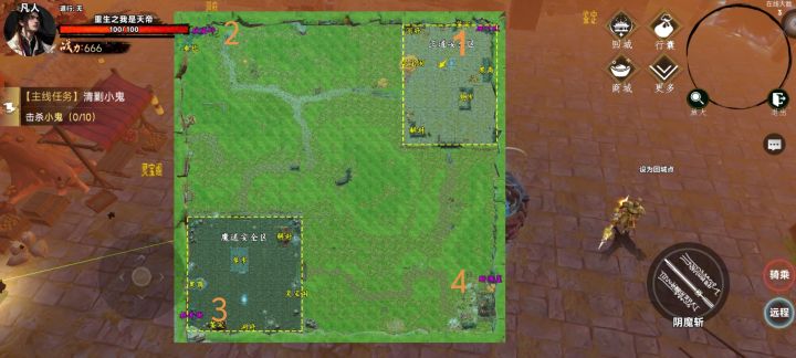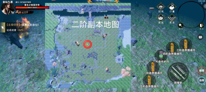 点击右上角放大即可获得全景地图,每副本地图都有一个精英怪和专属秘籍,对应境界的精英怪和秘籍都会掉落相应的阶级装备和符箓副本里的小怪是我们前期金币的主要获取方式,越高级的小怪掉落的金币越多,精英怪和boss会掉落我们所需的符箓还有装备以及称号每个地图的精英怪位置都是固定的,(上图⭕所在位置即为精英怪所在的位置)但是每个图的副本会刷新在随机位置,精英怪五分钟刷新一次,副本为二十分钟刷新一次。萌新