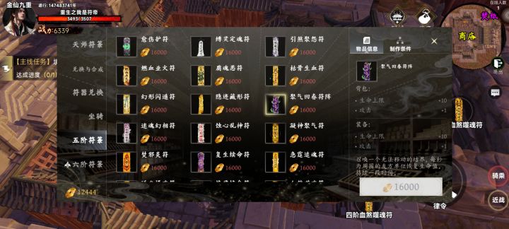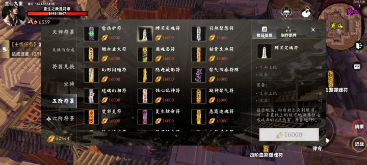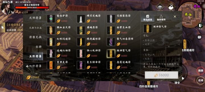 符箓是我们主要攻击手段,每种符箓都有不同的攻击和回血效果,符箓的等级越高基础伤害就越高,五级符箓以上还有攻击力和血量加成效果符箓主要来源就是各个副本的精英怪和boss,还能在灵宝阁直接购买五级以下随机符箓或者合成指定四阶以下符箓,宗门商店可以合成五级符箓还能购买六级符箓主要说一下比较实用的几张符箓血煞噬魂符,无攻击前后摇的群攻符箓(神符)缚灵定魂符,有攻击前摇,会眩晕目标,前期碰到打不过的