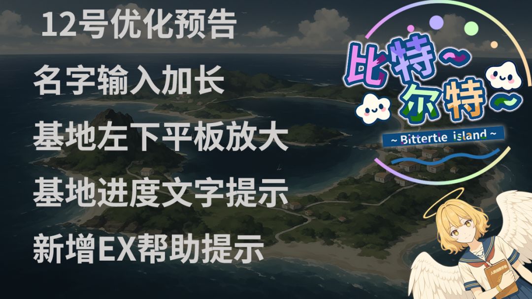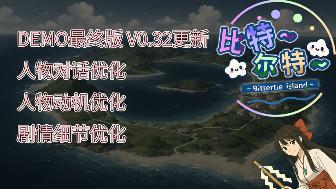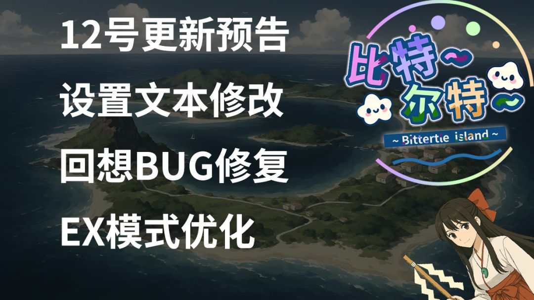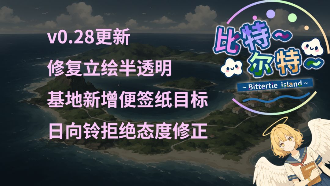 《比特尔特岛》Demo V0.28 更新公告(02.23) 【剧情优化】 1.日向铃在第一次拒绝主角帮忙的部分显得更加的柔和有目的性。 日向铃拒绝只是因为自己认为巫女的职责需要自己抗,而不是对主角的拒绝和讨厌。 【体验优化】 1.基地上方增加了便签纸,明确了游戏的目标。 较多的玩家反馈不太清楚上岛后要干嘛,所以增加了一个便签纸提示游戏的核心目的。 【BUG修复】 1.修复了快进模式下立绘半透明的问