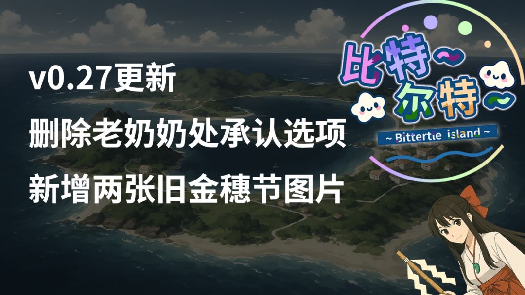 v0.27更新 删除老奶奶处承认选项 新增两张旧金穗节图片 CNGAL:https://www.cngal.org/entries/index/5238 NGA:https://bbs.nga.cn/read.php?tid=45991506 小黑盒:https://www.xiaoheihe.cn/app/topic/game/pc/4305240 TAPTAP:https://www.tapt