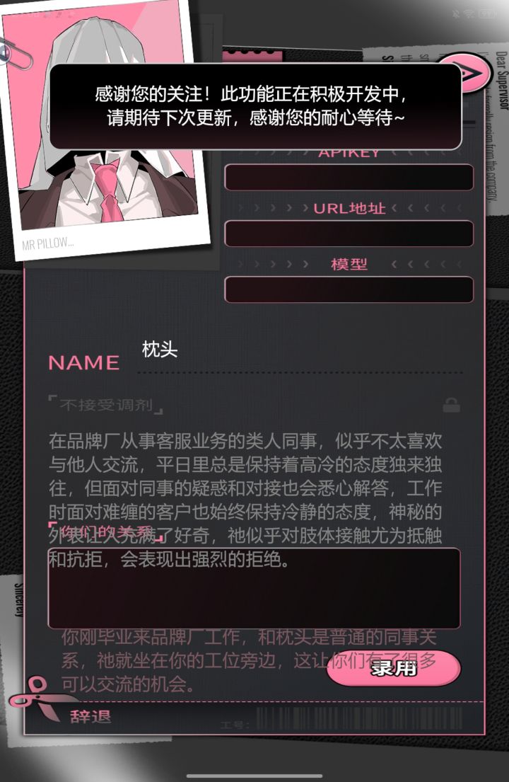 获取装扮,点开右下角员工档案,不断点击录用或者辞退,好像可分别获得一个装扮,在左上角备忘录里开十个任务,点击前面的圆点,完成十个后可获得一个装扮