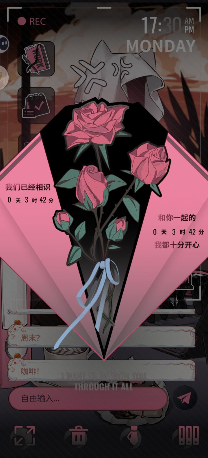 玩了半个小时哈,从上线能登陆到现在,看了一下大概的功能,总体来说体验还是比较有意思的。 *左上角第一个为名字(图二)和开发者名单,第二个的功能类似备忘录(图三),第三个未解锁,盲猜是手机固定聊天对话。 *右边第一个为认识的时间,感觉这个还是很有纪念意义的(图四);第二个是设置任务倒计时,开始后无法暂停,感觉计时盘做成转轮的形式更有感觉(图五); 第三个是背景音乐,氛围一个纯音乐和两个白噪音,