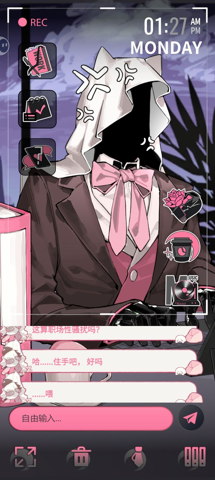 玩了半个小时哈,从上线能登陆到现在,看了一下大概的功能,总体来说体验还是比较有意思的。 *左上角第一个为名字(图二)和开发者名单,第二个的功能类似备忘录(图三),第三个未解锁,盲猜是手机固定聊天对话。 *右边第一个为认识的时间,感觉这个还是很有纪念意义的(图四);第二个是设置任务倒计时,开始后无法暂停,感觉计时盘做成转轮的形式更有感觉(图五); 第三个是背景音乐,氛围一个纯音乐和两个白噪音,