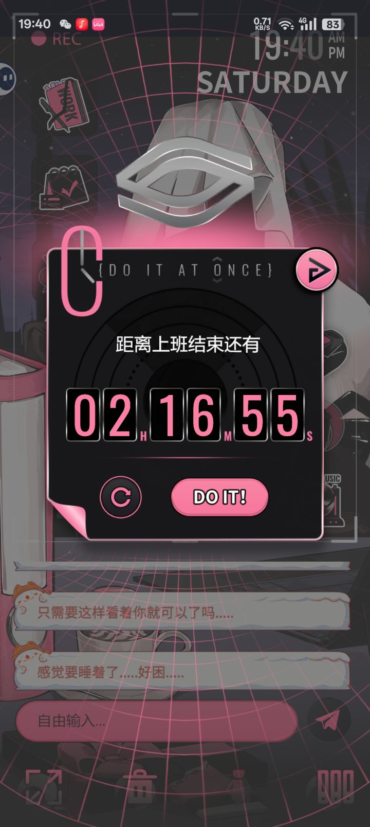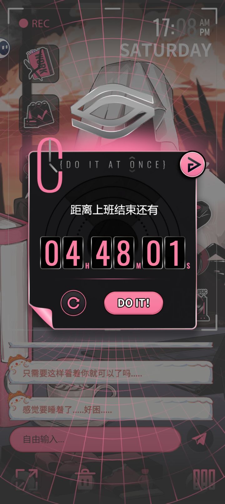玩了半个小时哈,从上线能登陆到现在,看了一下大概的功能,总体来说体验还是比较有意思的。 *左上角第一个为名字(图二)和开发者名单,第二个的功能类似备忘录(图三),第三个未解锁,盲猜是手机固定聊天对话。 *右边第一个为认识的时间,感觉这个还是很有纪念意义的(图四);第二个是设置任务倒计时,开始后无法暂停,感觉计时盘做成转轮的形式更有感觉(图五); 第三个是背景音乐,氛围一个纯音乐和两个白噪音,