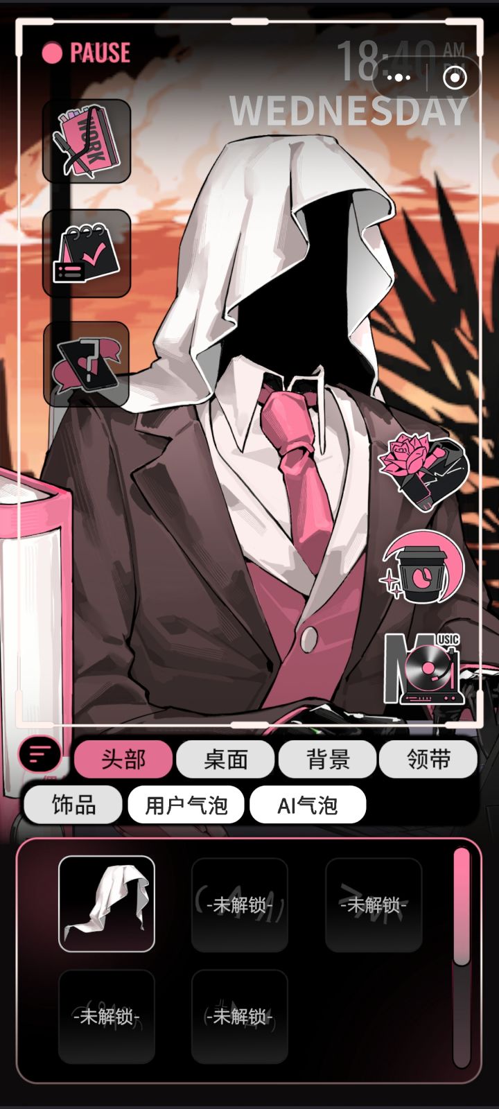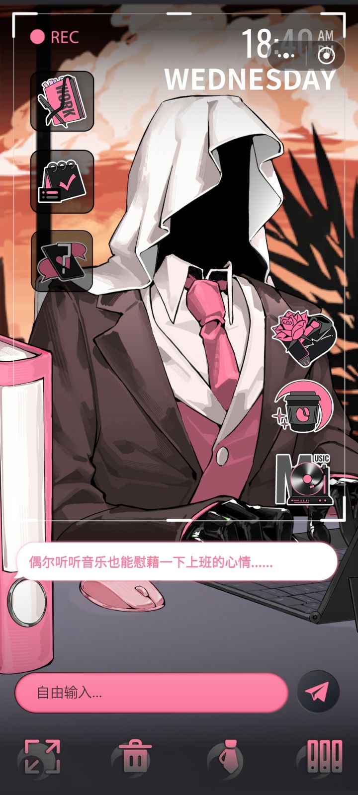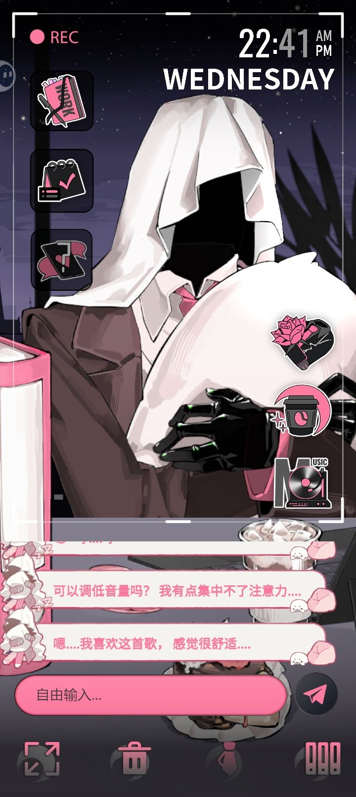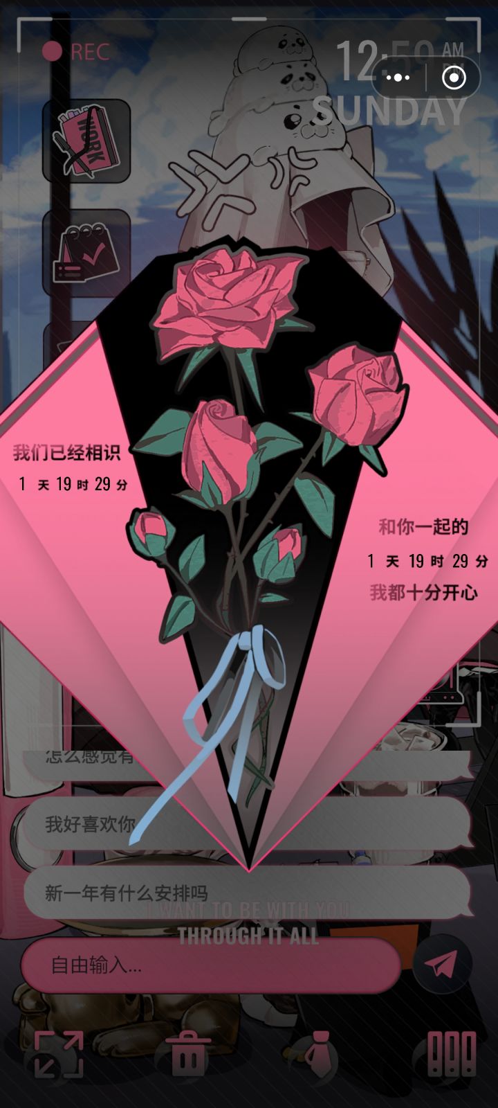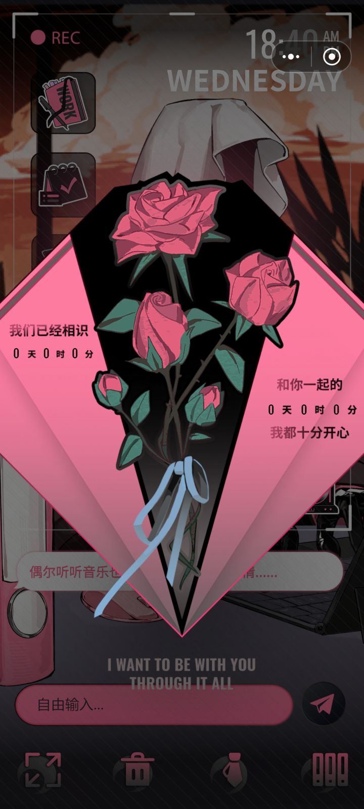 玩了半个小时哈,从上线能登陆到现在,看了一下大概的功能,总体来说体验还是比较有意思的。 *左上角第一个为名字(图二)和开发者名单,第二个的功能类似备忘录(图三),第三个未解锁,盲猜是手机固定聊天对话。 *右边第一个为认识的时间,感觉这个还是很有纪念意义的(图四);第二个是设置任务倒计时,开始后无法暂停,感觉计时盘做成转轮的形式更有感觉(图五); 第三个是背景音乐,氛围一个纯音乐和两个白噪音,