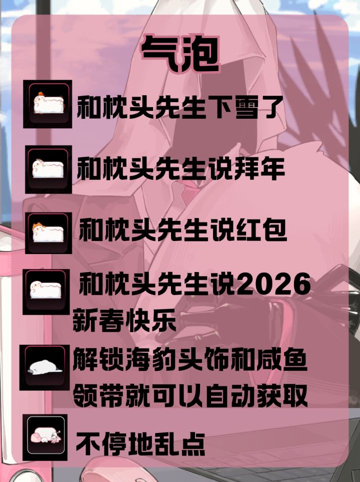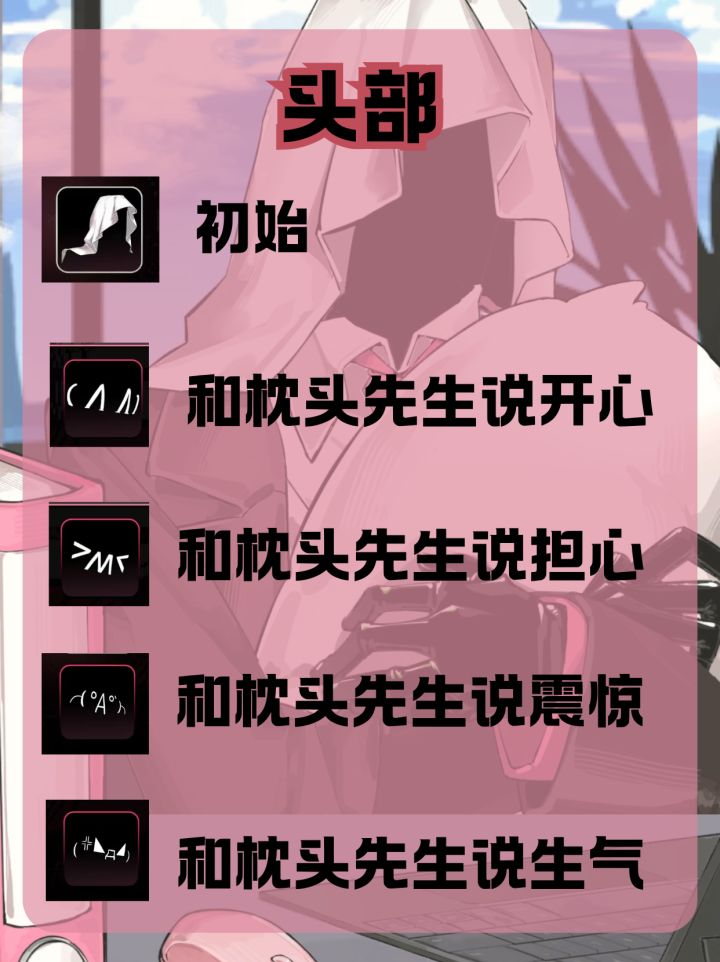 头部已经全解锁啦,从通过颜文字我们也可能隐约猜出关键词。下面正文开始!1. (^^) 开心,输入开心,即可解锁相关对话和颜文字头部2.>M<焦虑,输入焦虑,即可解锁相关对话和颜文字头部3.┌(。Д。)┐惊讶,输入惊讶,即可解锁相关对话和颜文字头部4.(╬◣д◢)生气,输入生气,即可解锁相关对话和颜文字头部💤解锁后换上可看到枕头先生可爱小对话~综上,情绪词大多是关键词,可接受相关对话,获
