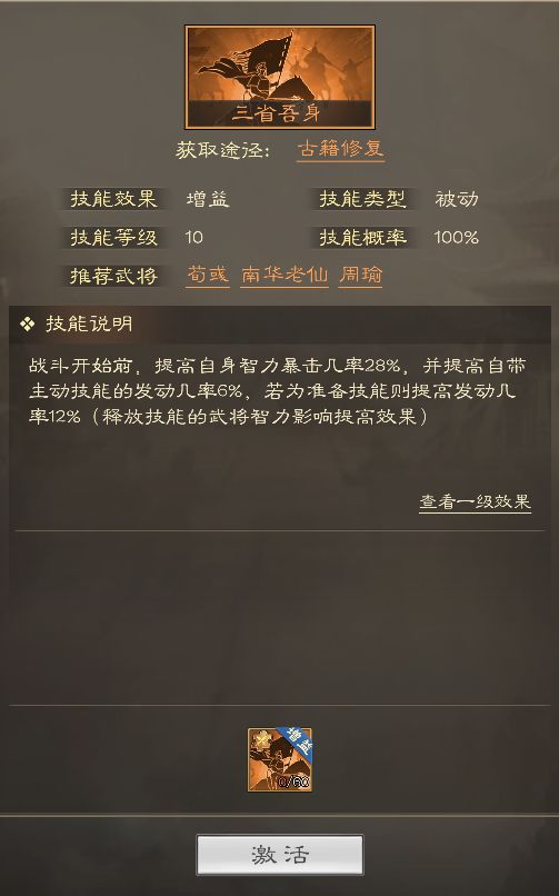 亲爱的主公们,《奇兵谋略》S2 新赛季即将震撼登场,一场前所未有的策略盛宴正蓄势待发!新赛季不仅带来了强力的新技能、独具特色的武将,更有丰富的系统玩法革新。现在,就为大家详细解读 S2 新赛季的精彩内容。新技能前瞻三省吾身 获取途径:古籍修复技能类型:被动满级效果:战斗开始前,提高自身智力暴击几率 28%,并提高自带主动技能的发动几率 6%,若为准备技能则提高发动几率 12%(释放技能的