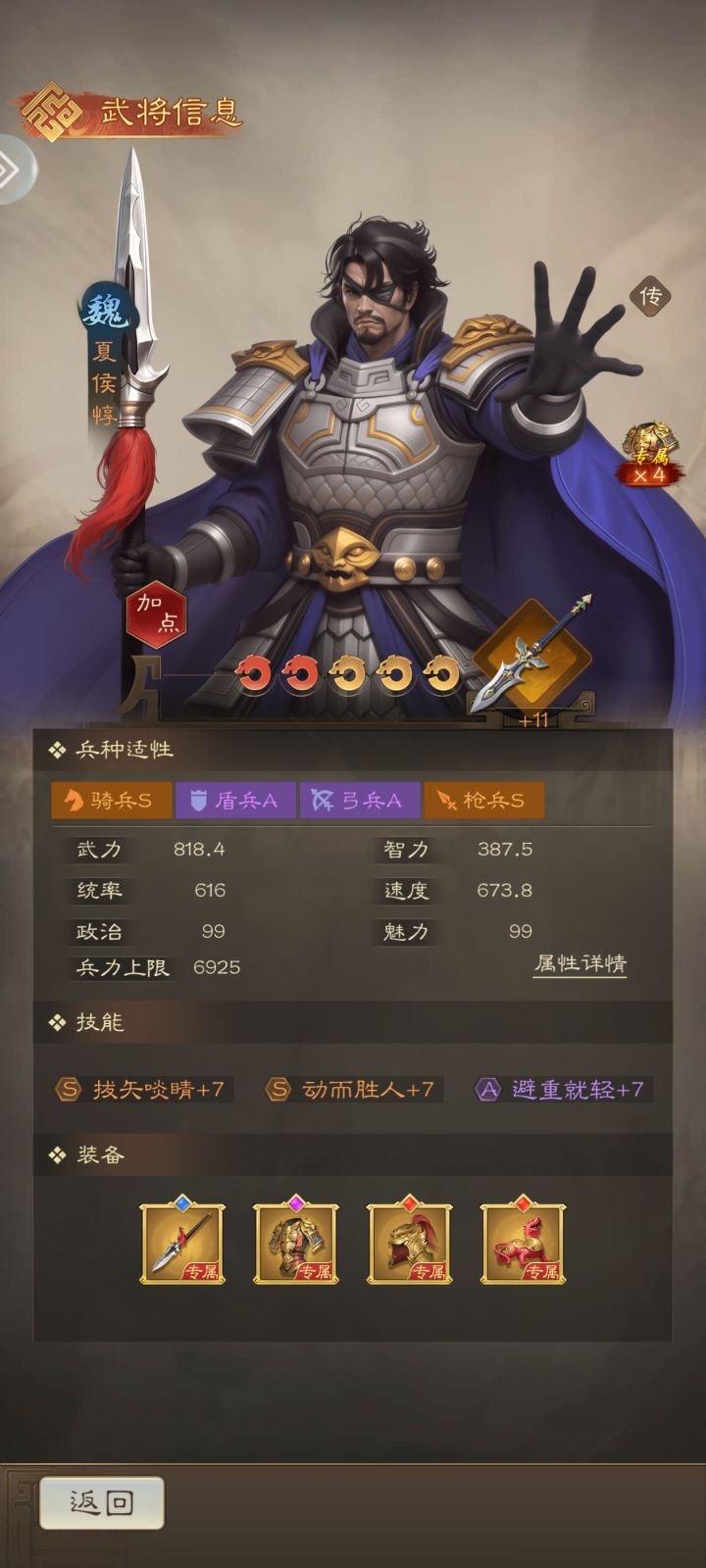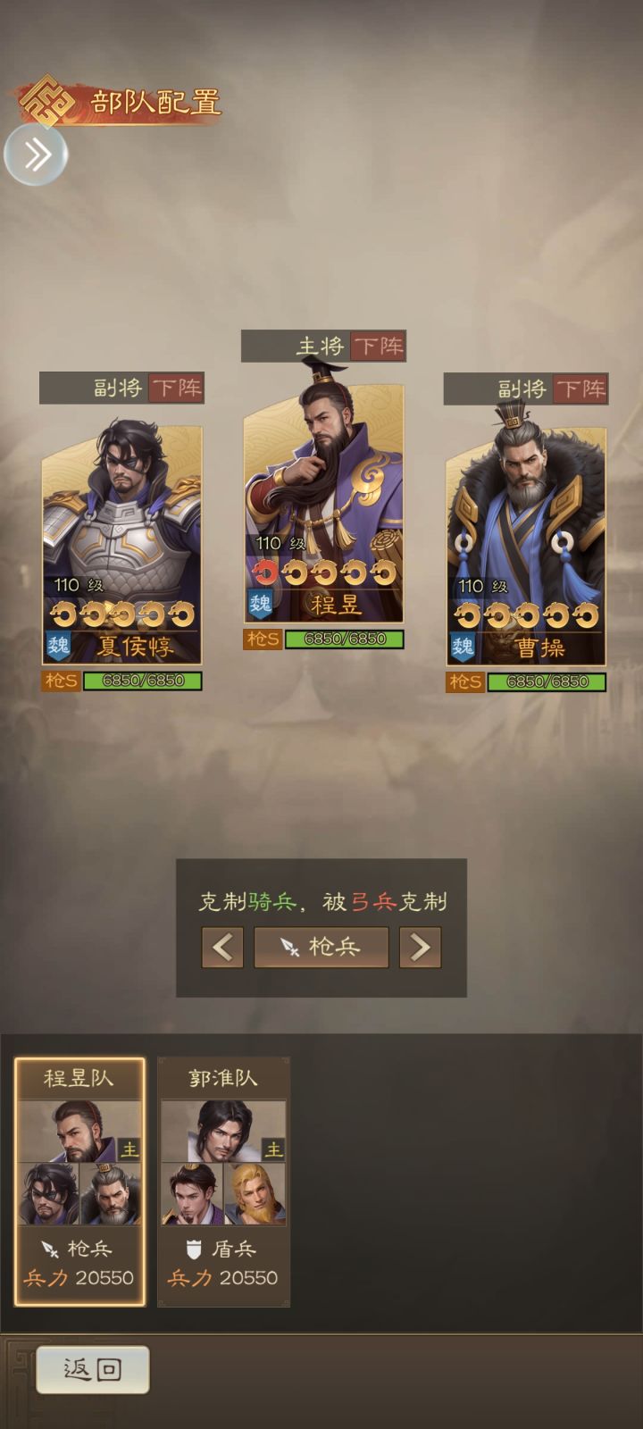 ▎S1魏枪开荒期 夏侯惇【主将】:落凤独鸣(对敌方1人进行1次武力攻击,伤害系数250%并使他进入懈怠状态,持续1回合) 程昱:御敌屏障(第1至3回合降低我方2人受到的伤害25%) 曹操:智勇兼备(提高我方3人的武力、智力100点直至战斗结束) ▎S1魏枪养成期 上面说了,魏枪本质上是单核阵容,所有的资源我们都要给夏侯惇。所以武将升星时,我们的升星优先级为:夏侯惇>程昱>曹操。