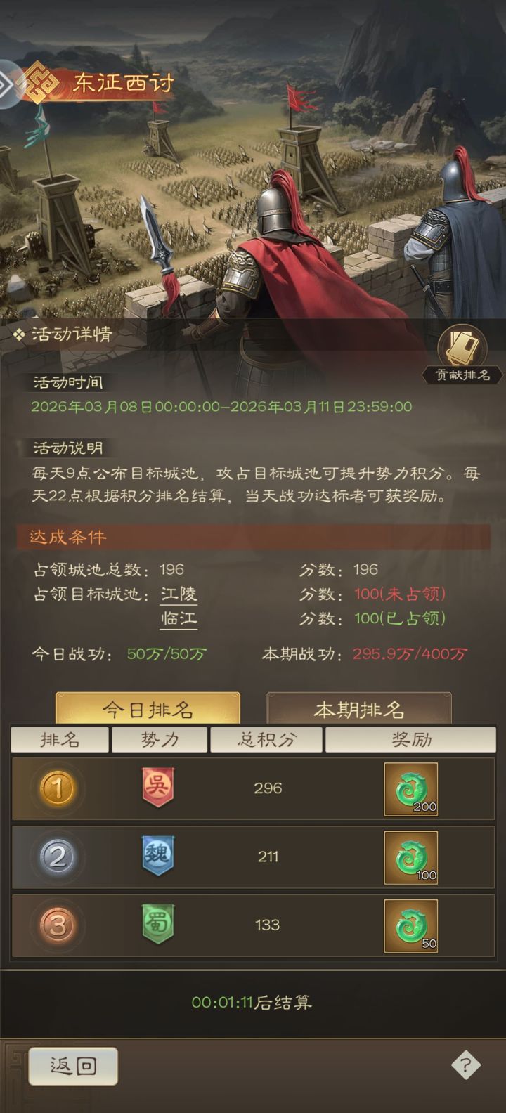 新手进游戏注意事项参照排兵布阵界面其他玩家,已说得很好,不再赘述。这里略微聊一聊常驻活动,这些活动有需要花玉璧的,也有赚玉璧的,做好支出规划肯定是能越来越有钱的。 赚玉璧活动主要有: 异族入侵(单次活动上限2000玉璧)。 诸侯讨懂(单次活动大致也能2000玉璧还可以刷技能点,看人多不多)。 特产城市(极限全服只有一个国家就可以3000玉璧及其他资源若干,包括将魂3个或求贤令15个等),夷