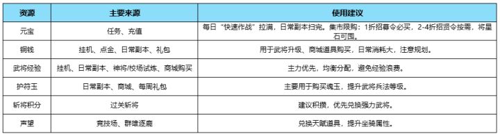 开场语 各位主公好!本期为大家带来新手开局全面攻略,从资源使用到武将培养,助你起步更顺畅,少走弯路!一、快速升级途径1. 挂机收益挂机可获得铜钱、角色/武将经验、技能碎片、装备等。通过“快速作战”可直接领取2小时挂机收益,收益随等级提升。VIP等级提高可增加挂机收益及离线收益时长,开通“快速作战特权”还能增加次数。参与“安定平叛”也能提升挂机收益哦!2. 征战副本随着副本推进