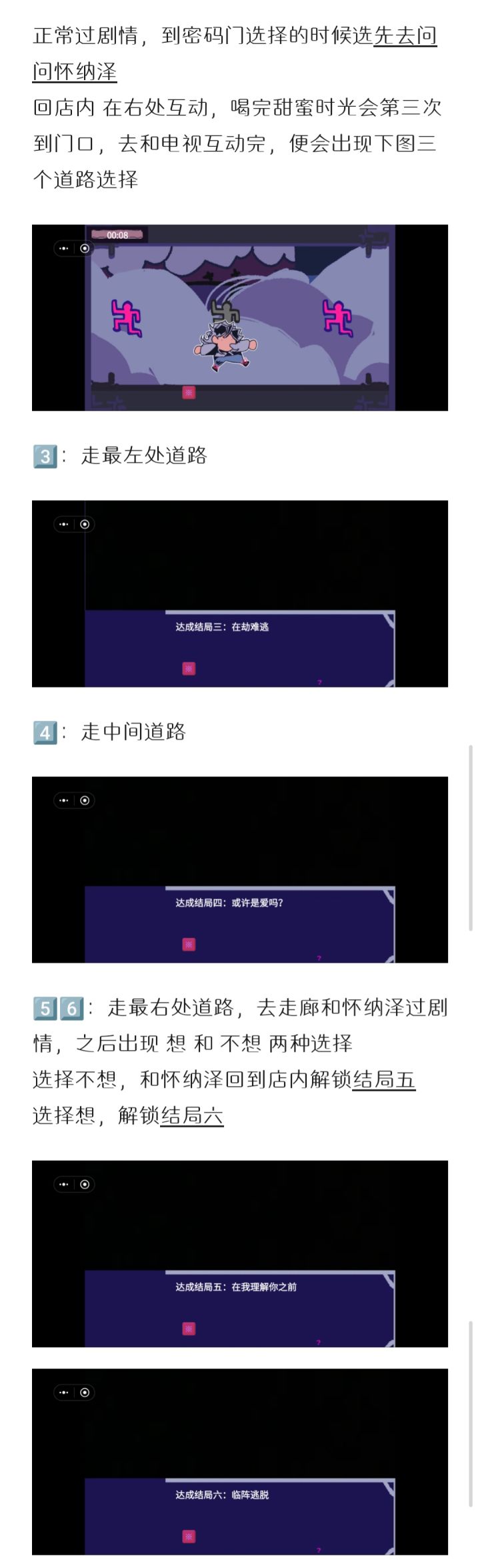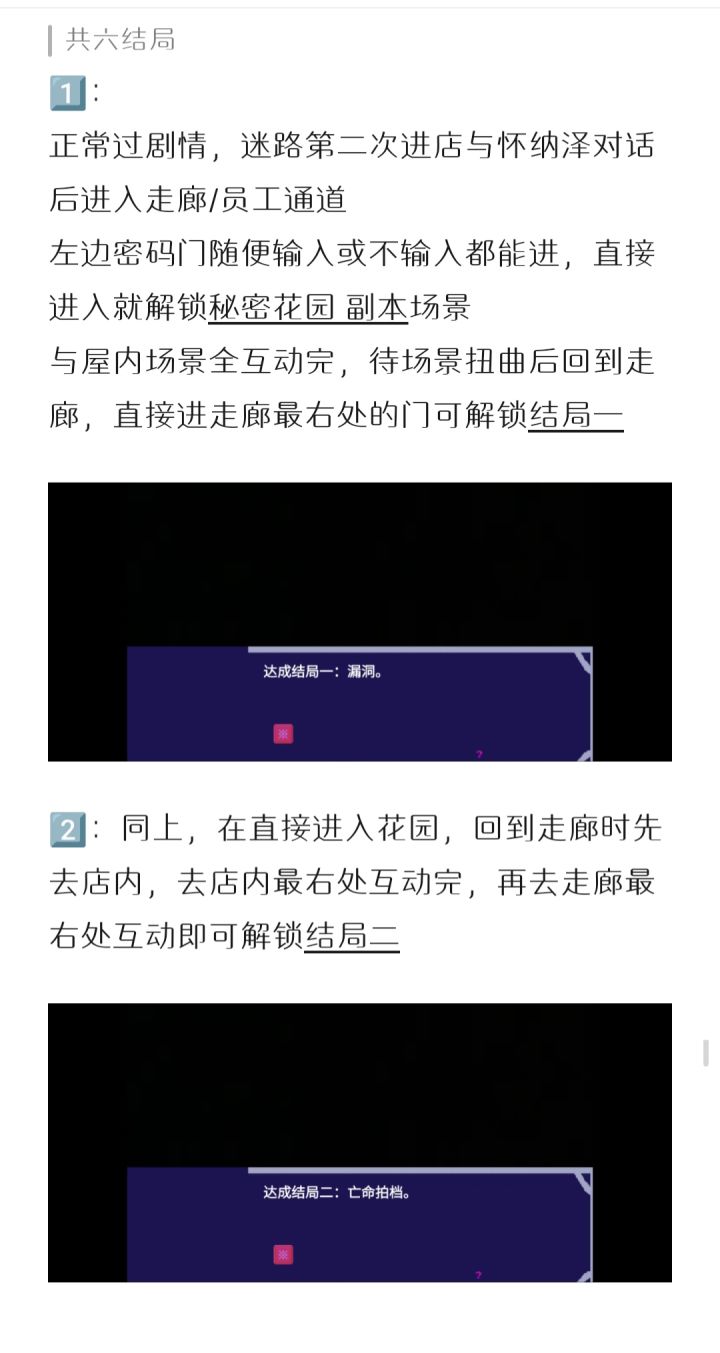 是自己摸索出来的,可能有不足的地方,请见谅顺便说下我个人评价:反正我感觉挺不错的,也没有很难,光解锁结局一二的话会有点搞不明白剧情,全打完就清楚了。全通过也不会花很长时间